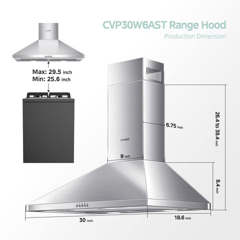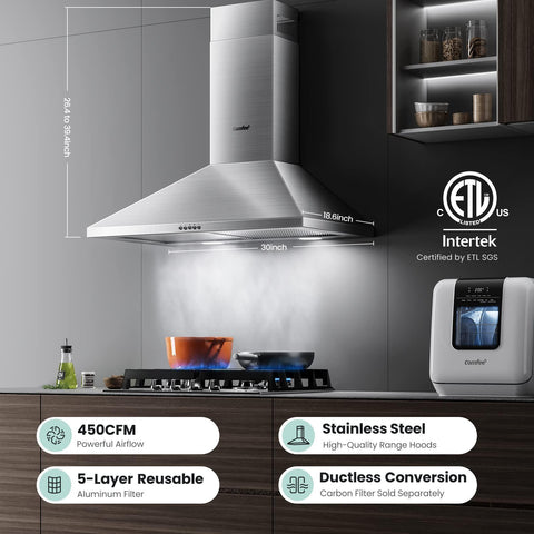 Details: COMFEE' CVP30W6AST Ducted Pyramid Range 450 CFM Stainless Steel Wall Mount Vent Hood with 3 Speed Exhaust Fan, 5-Layer Aluminum Permanent Filters, Two LED Lights, Convertible to Ductless, 30 inches