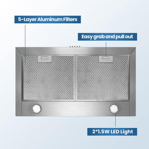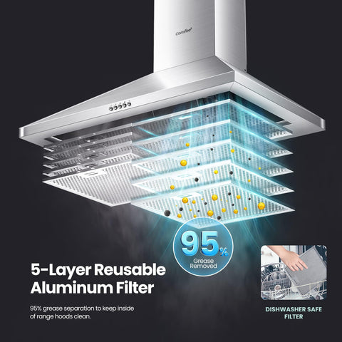 - 5-Layer Reusable Aluminum Filter: The 5-layer aluminum filter effectively removes grease and cooking odors. Also, being easily detached and dishwasher safe, it can always sustain its optimal efficiency.