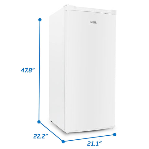 Details: With a large capacity of 5 cubic feet, this COMMERCIAL COOL upright freezer features an adjustable thermostat so your food is always stored at the correct temperature. Our outstanding deep freeze (21.5” x 22.2” x 47.8”) opens from the front for easy access with a convenient reversible door. The space-saving, flat back design of this fantastic freezer and small footprint (81.6 lbs.) allows you to place in smaller areas of your home, office, or garage. With 4 full-width interior steel wire shelves, you can organize frozen meals, snacks, and ice seamlessly. Also included are adjustable leveling legs to ensure your compact freezer sits evenly. This deep freeze is ETL energy and safety certified, uses R600a, and is delivered in ISTA-6A packaging. Our chest freezer 5 cu. ft with manual defrost ensures you’ll never run out of frozen goods again!