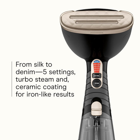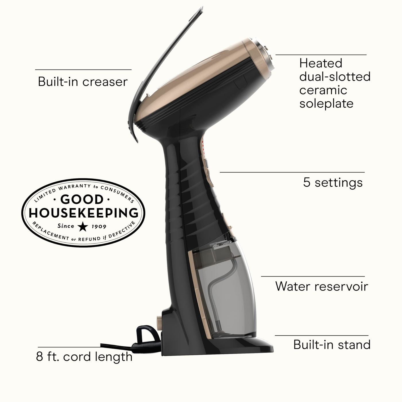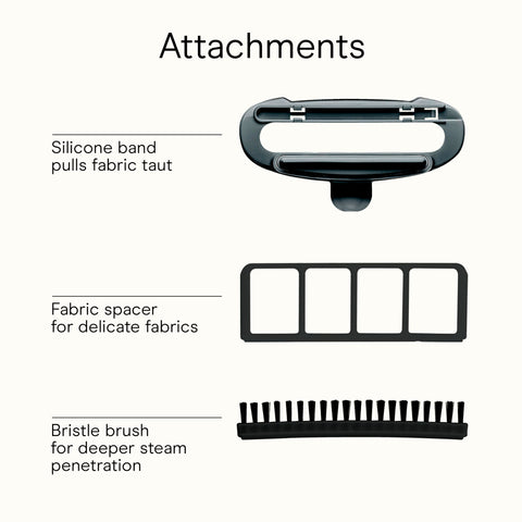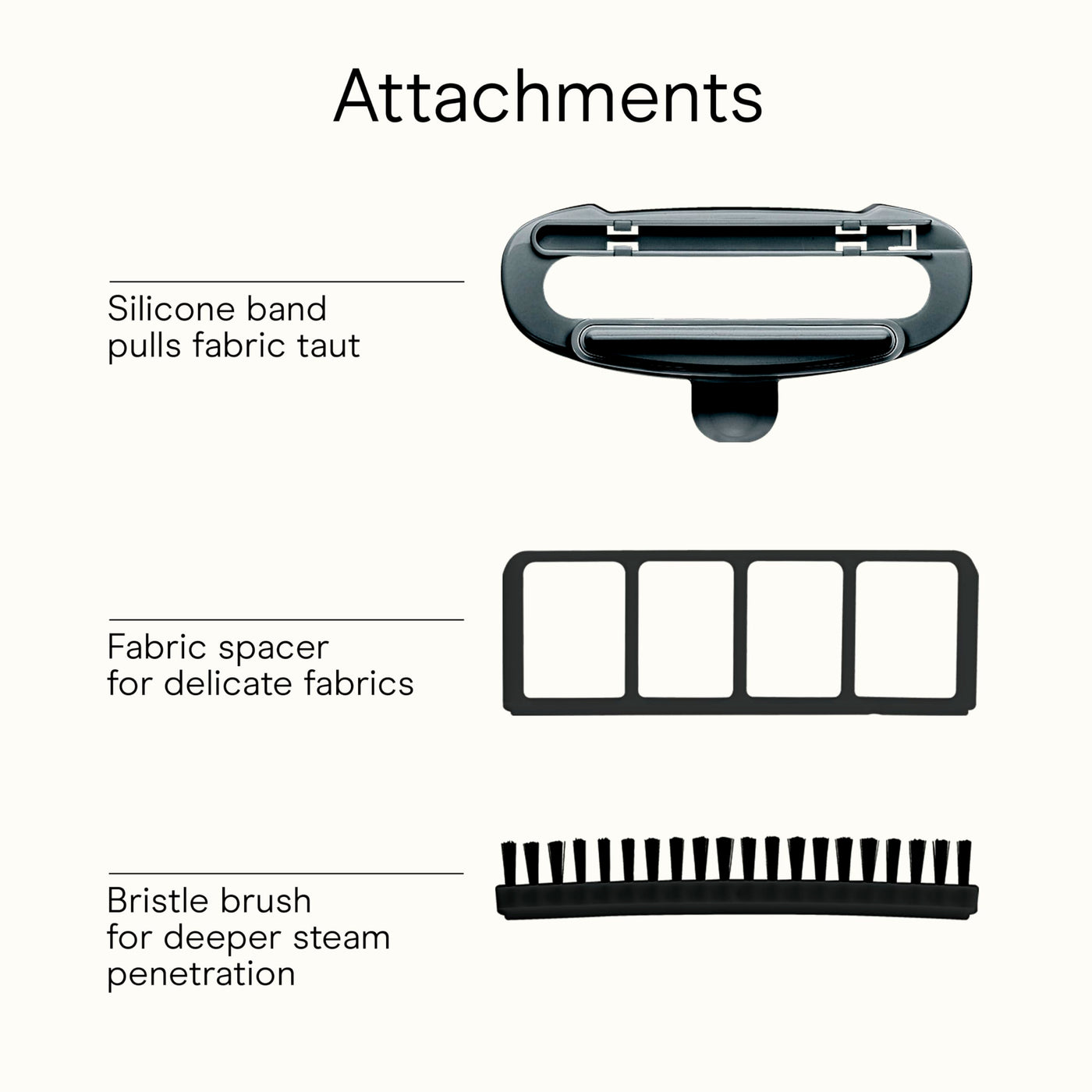 - 3-IN-1 ATTACHMENT: This portable steamer for clothes includes a silicone band to pull fabric taut, a delicate fabric spacer to protect trims and fine fabrics, and a bristle brush to ensure steam penetrates fibers for a perfect press, even on heavy fabrics.