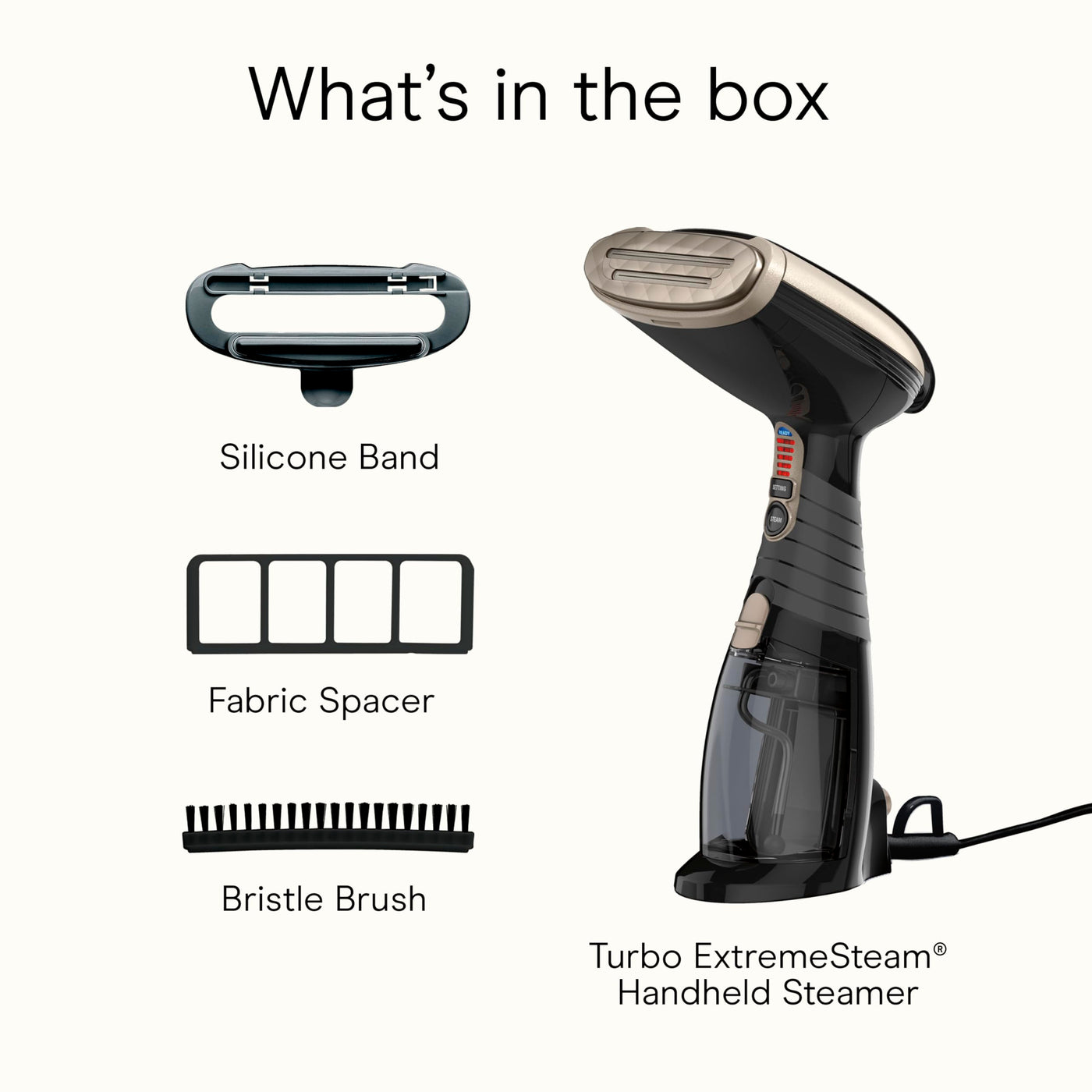 Details: Smooth out your look Experience the power of the Conair Handheld Garment Steamer for Clothes for easier steaming. Advanced steam technology is driven by an exclusive 1875-watt steam generator. The clothes steamer comes with 5 steam settings, from delicate to supercharged turbo, to allow users to instantly release wrinkles on any garment or fabric and a built-in creaser for perfect pleats and folds. With 40-second heat-up and up to 20-minute steam time, this powerful Conair steamer for clothes with 3-in-1 attachment has a silicone band to pull fabric taut for easier steaming, a delicate fabric spacer, and bristle brush to loosen fibers for faster steam penetration. A lengthy 9 ft. Cord makes for convenient handling. Instantly release wrinkles, refresh upholstery, and give garments a professional, fresh-pressed look with the powerful Conair Turbo ExtremeSteam Handheld Fabric Steamer.