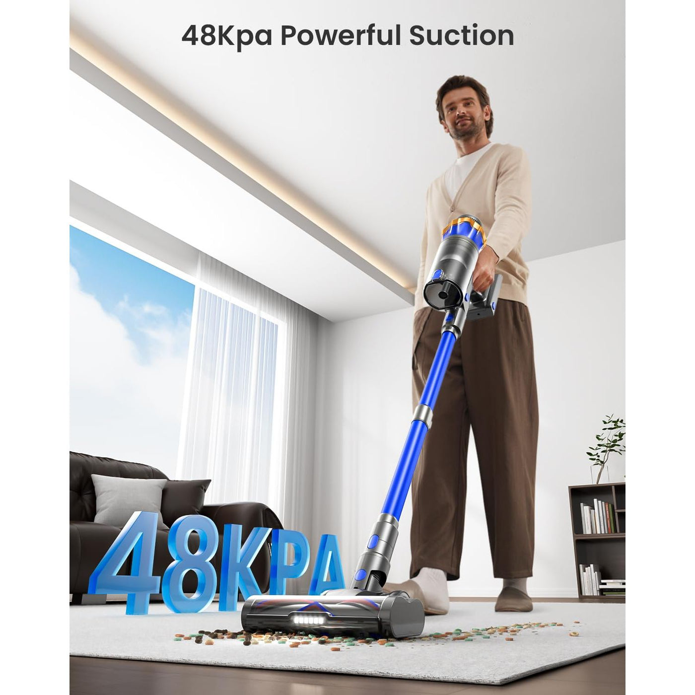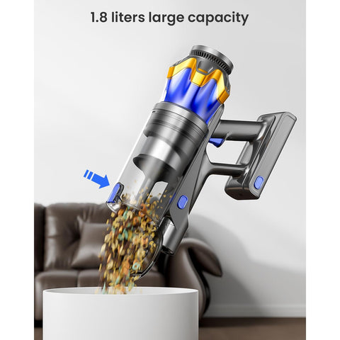 - [48KPA Powerful Suction] Cordless vacuum cleaner is equipped with a powerful 580W brushless motor with the strongest suction power up to 48,000Pa, which can easily capture dust, crumbs, pet hair and large particles on carpets, hardwood floors and tiles, and efficiently solve the cleaning problems.