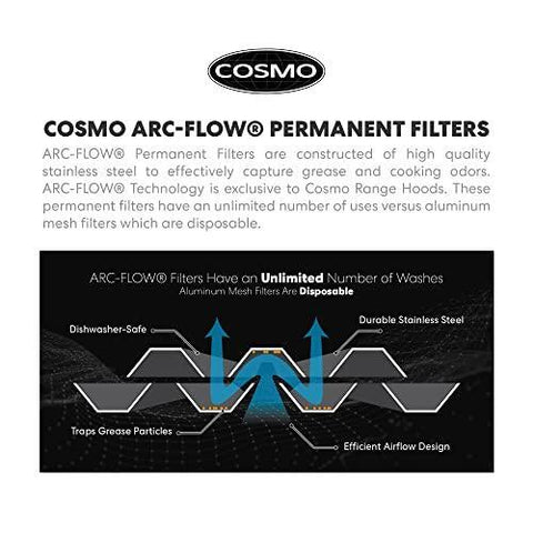 - EASY-TO-CLEAN FILTERS: Part of the Vista Collection. Cosmo ARC-FLOW Permanent Filters are dishwasher-safe and extremely durable. No need to replace these range hood filters, simply drop in the dishwasher for easy maintenance and cost savings