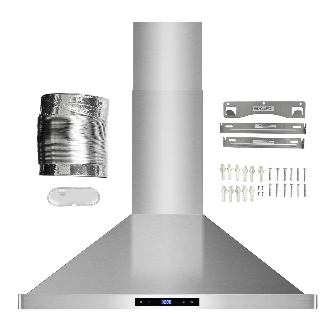 - 2-YEAR LIMITED PARTS: Our customer support team is based proudly in the USA. Range Hood Product Dimensions: 30 in. (W) x 19.75 in. (D) x Adjustable 25.6 in. - 39.4 in. (H). Electrical: 120V/60Hz, 3-prong plug. Duct Size: 6 in