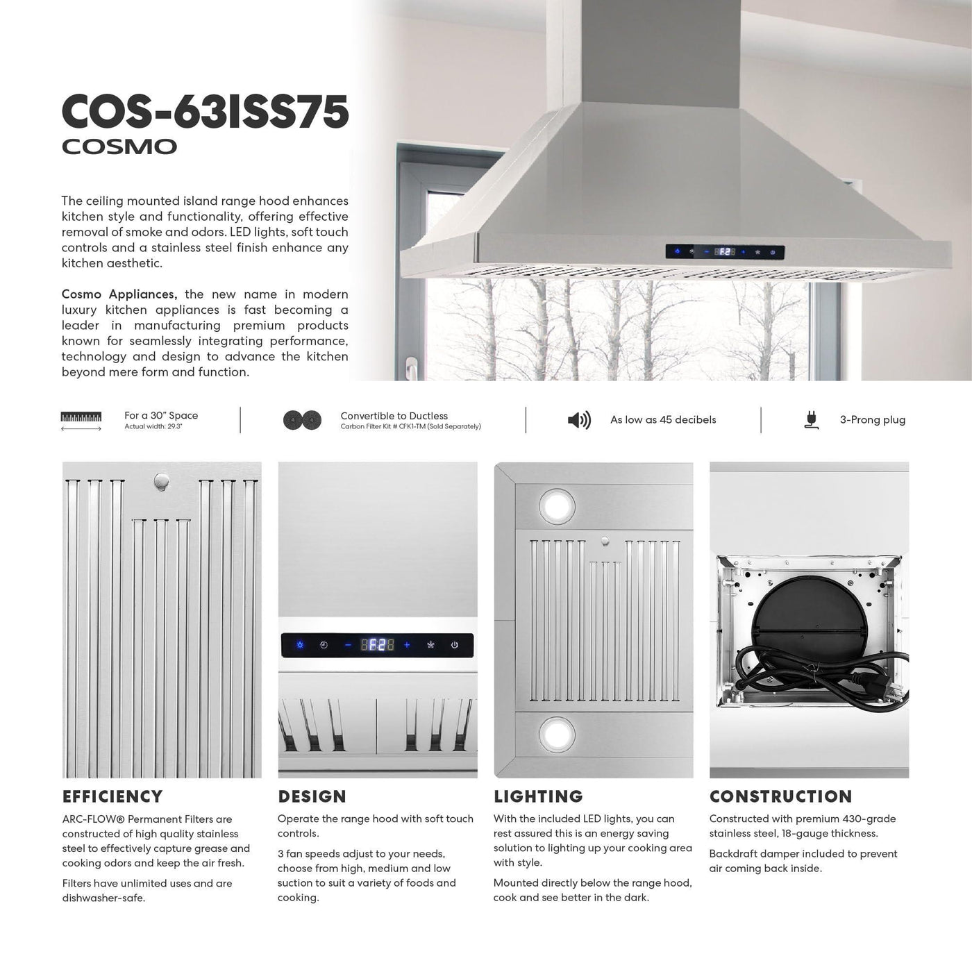 COSMO COS-63ISS75 30 in. Lumin Collection 380 CFM Ducted Island Range Hood, Soft Touch Controls, LED Lights, Stainless Steel Sale