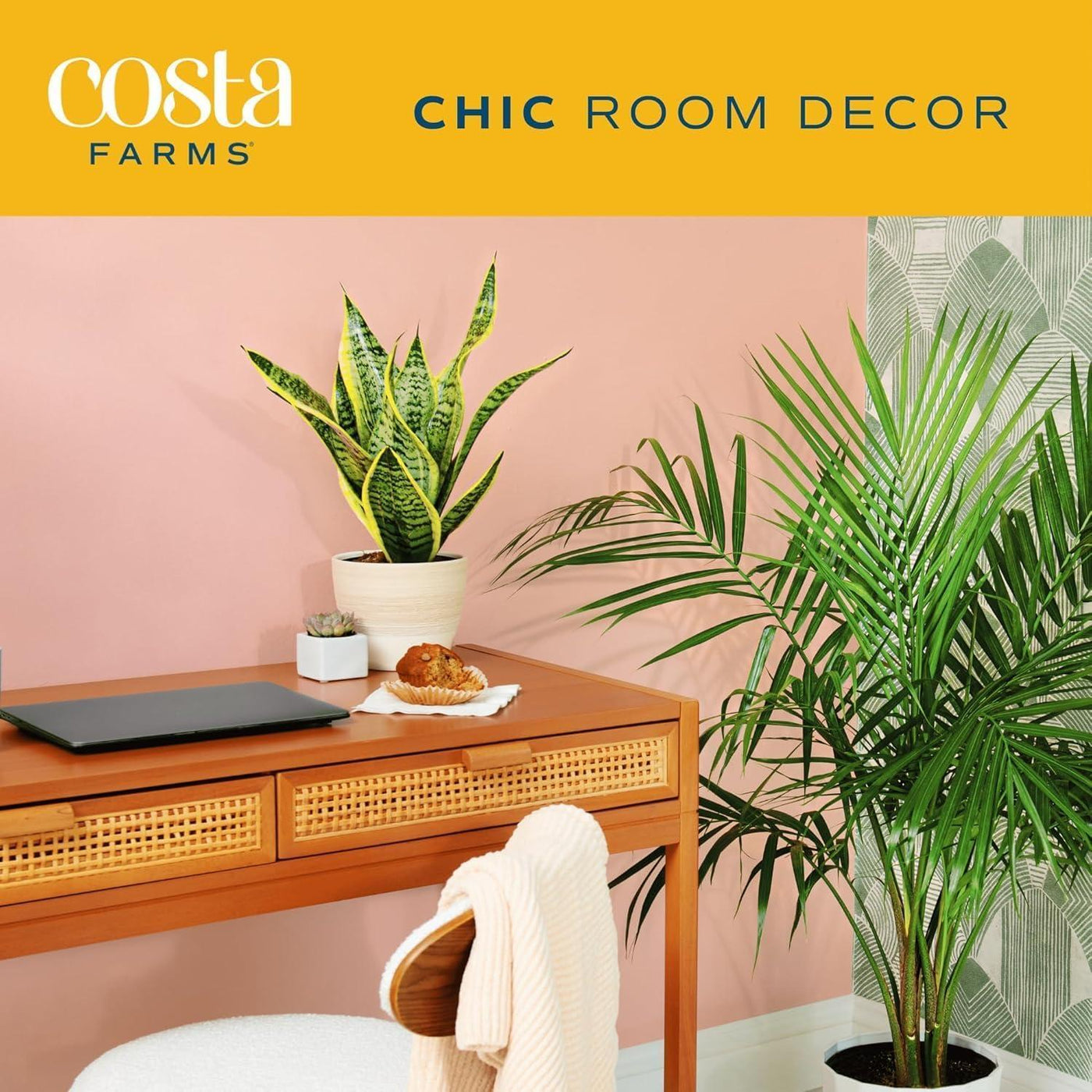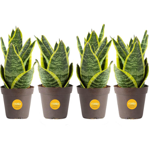 Details: If you're looking for an easy-care houseplant, the Costa Farms Snake Plant, 4-Pack is an excellent choice. This hardy indoor plant is still popular today, the Snake Plant or Mother-in-law's Tongue has been a long-time favorite because of how adaptable it is to a wide range of growing conditions. Most snake plant varieties have stiff, upright, sword-like leaves that may be banded or edged in gray, silver, or gold. The Sansevieria's architectural nature makes it a natural choice for modern and contemporary interior designs. It's one of the best houseplants around. Grow snake plant in just about any room of your home. While it tolerates low light, snake plant grows fastest in bright conditions. As long as you water it now and again, it's tough to underwater this hardy houseplant. An easy-to-grow house plant, water only when top soil is dry. Not only is this an extremely low maintenance house plant, it also functions as a living air purifier making it ideal for home and office settings. It's one of the best houseplants for any room of your home. Plants are living things; each one is slightly different, so the plant you receive may vary from the photo. Our growers hand pick the healthiest, best-looking, highest-quality plants. We package our plants for shipment with great care so they’ll arrive at your home ready to be displayed. We're unable to ship this item to: AK,AZ,CA,GU,HI. Our plants come in pots for all decorating needs: shelf size (7-14in tall), tabletop (16-24in), and floor (24-48in). Look for COSTA FARMS when buying plants online. Be aware of third-party sellers; other companies try to imitate our quality. On Amazon, there are no other authorized Costa Farms sellers. Look for “Ships from and sold by ” to ensure you’re getting our premium plants. Shipped fresh from our farm to you, Costa Farms is passionate about delivering happy, healthy, beautiful plants. Costa Farms plants are not intended for human or animal consumption. Keep out of reach of children and pets.
