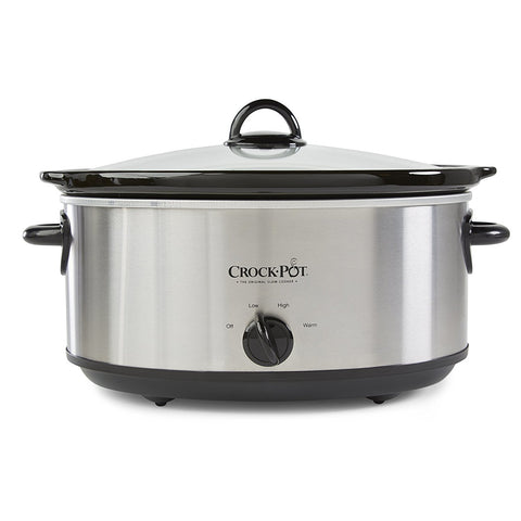 Details: This spacious Crock-Pot 7-Quart Oval Manual Slow Cooker offers flexibility and convenience. Designed to make your life easier, this slow cooker can fit a 7-pound roast comfortably and serves up to 9 or more people. Prepare a meal early, then let it slow-cook all day while you carry on with your routine. Come home to a nutritious, home-cooked meal in the evening. With settings for high or low slow cooking and a warm function, it's a convenient, healthier, and more cost-efficient way to serve delicious meals. The slow cooker's exterior is stainless steel with black accents, adding a stylish touch to any kitchen.