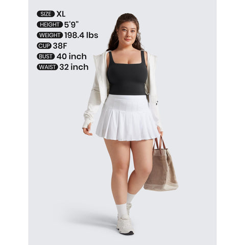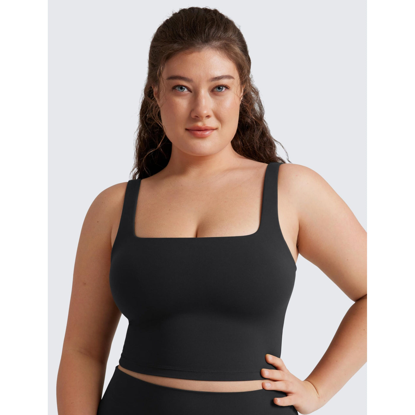 - Cropped tank top that sits above the belly button, pairs well with high-waisted pants