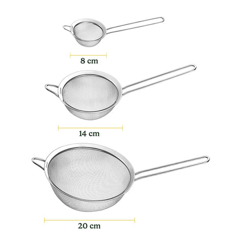- INCLUDED: The Cuisinart set of strainers comes in 3 sizes from 3-⅛-inch, 5-½-inch and 7-⅞-inch sizes