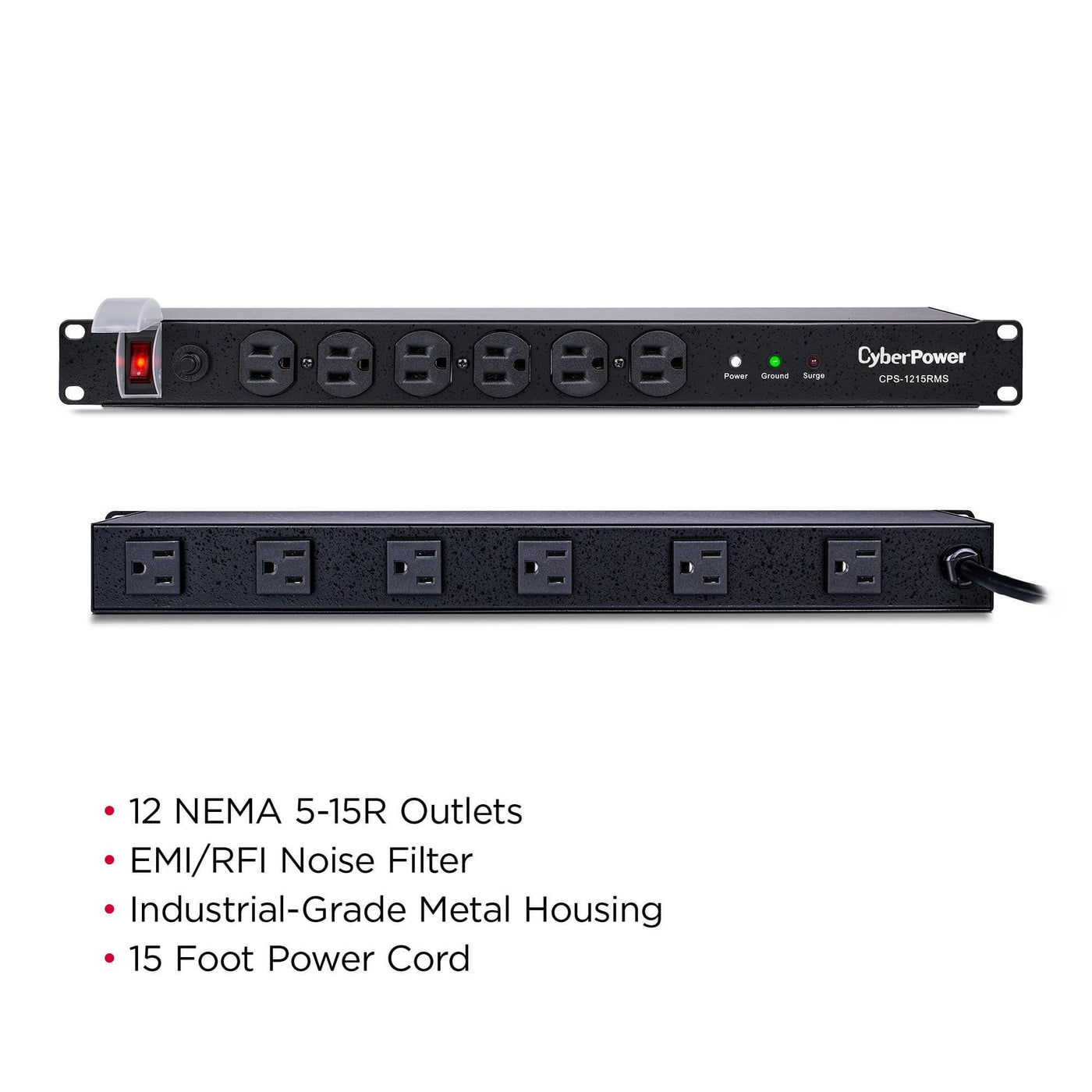 Details: Engineered for the most demanding applications, the professional-grade Rackbar™ CPS1215RMS safeguards systems and networking equipment by absorbing spikes in energy caused by storms and electrical power surges. Designed for network environments, the CPS1215RMS also performs superbly for home office use, providing 1800 joules of protection, 15-Amp electrical capacity with circuit breaker, and 12 surge-protected outlets (6 front, 6 rear). Industrial-grade metal housing keeps this Rackbar performing flawlessly. The CPS1215RMS has a 1U racksize and can be mounted horizontally. Features of the CPS1215RMS include an EMI/RFI noise filter, industrial-grade metal housing, AC power cord (15 ft.). The CPS1215RMS also comes with a three-year limited warranty.