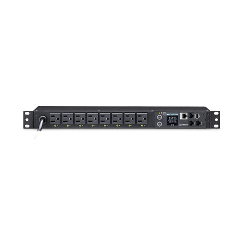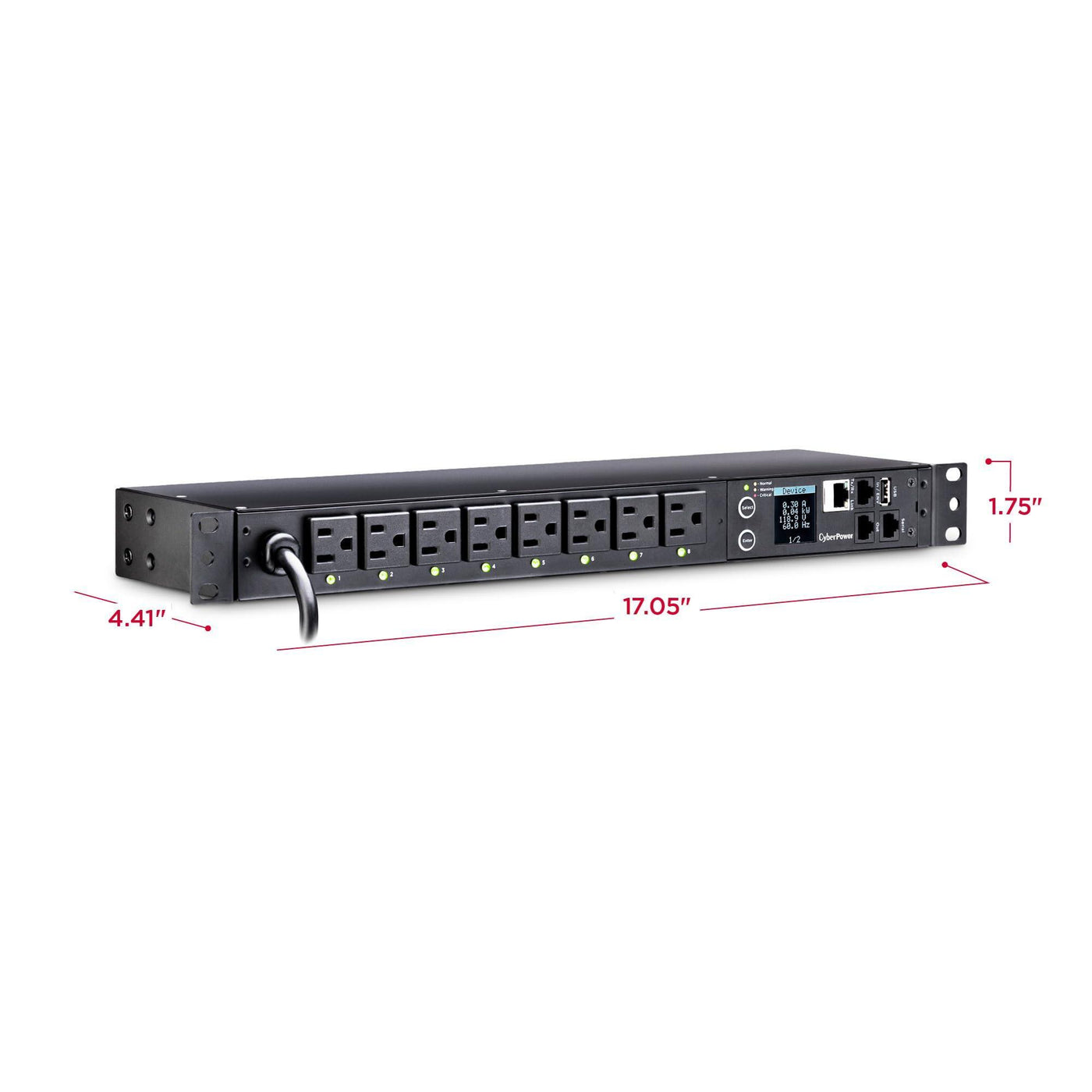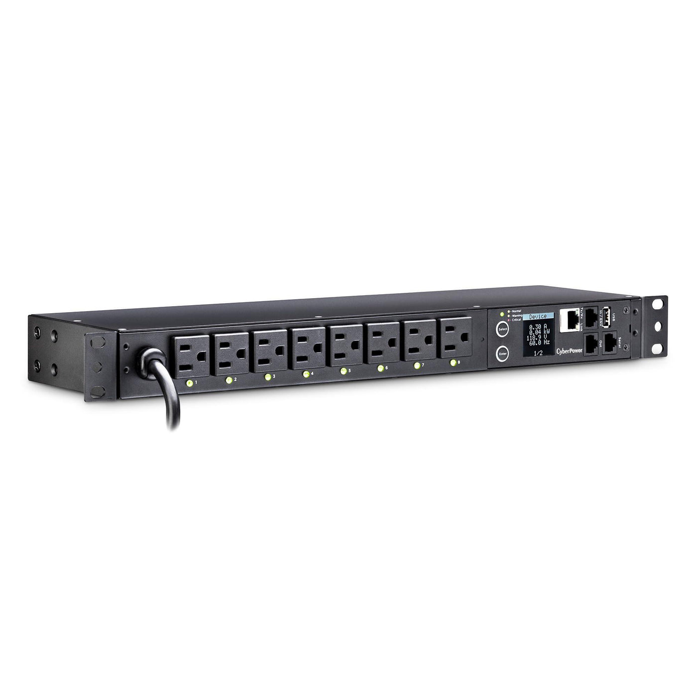 Details: The CyberPower PDU41001, an 8-outlet (front), 1U rackmount switched power distribution unit (PDU), provides 120V 15A output. It distributes power to 8 NEMA 5-15R receptacles from a single NEMA 5-15P plug with unfiltered electrical pass-through. The switched outlet receptacles can be managed individually or collectively over the network, using the CyberPower Management Console, a web browser, and the RJ45 Ethernet port for network connection, or locally by using the LCD controls.