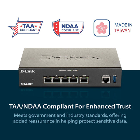 Details: The D-Link DSR-250v2 Unified Services VPN Router provides a high-performance networking solution to address the growing needs of small and medium-sized businesses. It supports dual WAN Gigabit Ethernet ports to provide high availability for WAN or Internet connections. Traffic can be load-balanced across the links with Outbound Load Balancing, increasing the performance and availability of business applications. The secondary WAN port can also create a DMZ, isolating servers from the LAN. The DSR-250v2 supports mobile broadband networks via an extendable USB modem2, such as 3G/4G/5G dongles. Traffic load balancing can also be performed on mobile data connections, providing an additional layer of redundancy for critical or backup applications.
