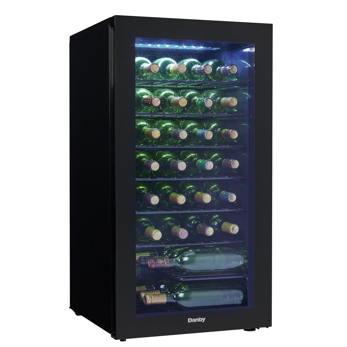 Details: The best way to store and chill your precious wine collection is with Danby's fashionable and convenient free-standing wine cooler. This spacious unit is designed to store up to 36 bottles of your favorite wines on attractive black wire shelving. The blue LED interior lighting beautifully showcases the bottles through an elegant tempered-glass door designed to protect your collection from potentially harmful ultraviolet rays and displays your collection with pure sophistication. The temperature of the wine cooler will stay between 6°C and 14°C (43°F and 57°F) ensuring the bottles will always be at a temperature best preferred. This appliance features a discrete pocket-style handle and a smooth back design to allow the installation to be flush against a wall. The handy reversible door enables you to open it from the left or right-hand side. Includes a 12-month on parts and labor with in-home service.