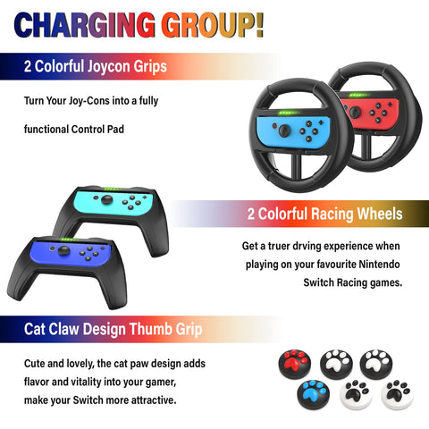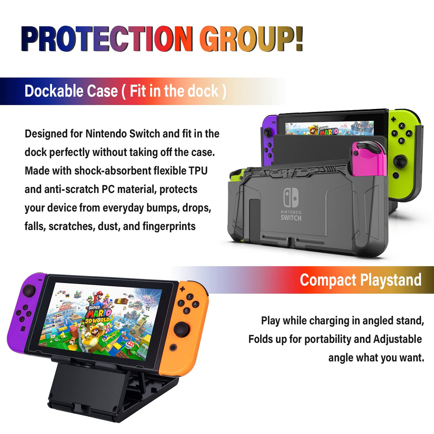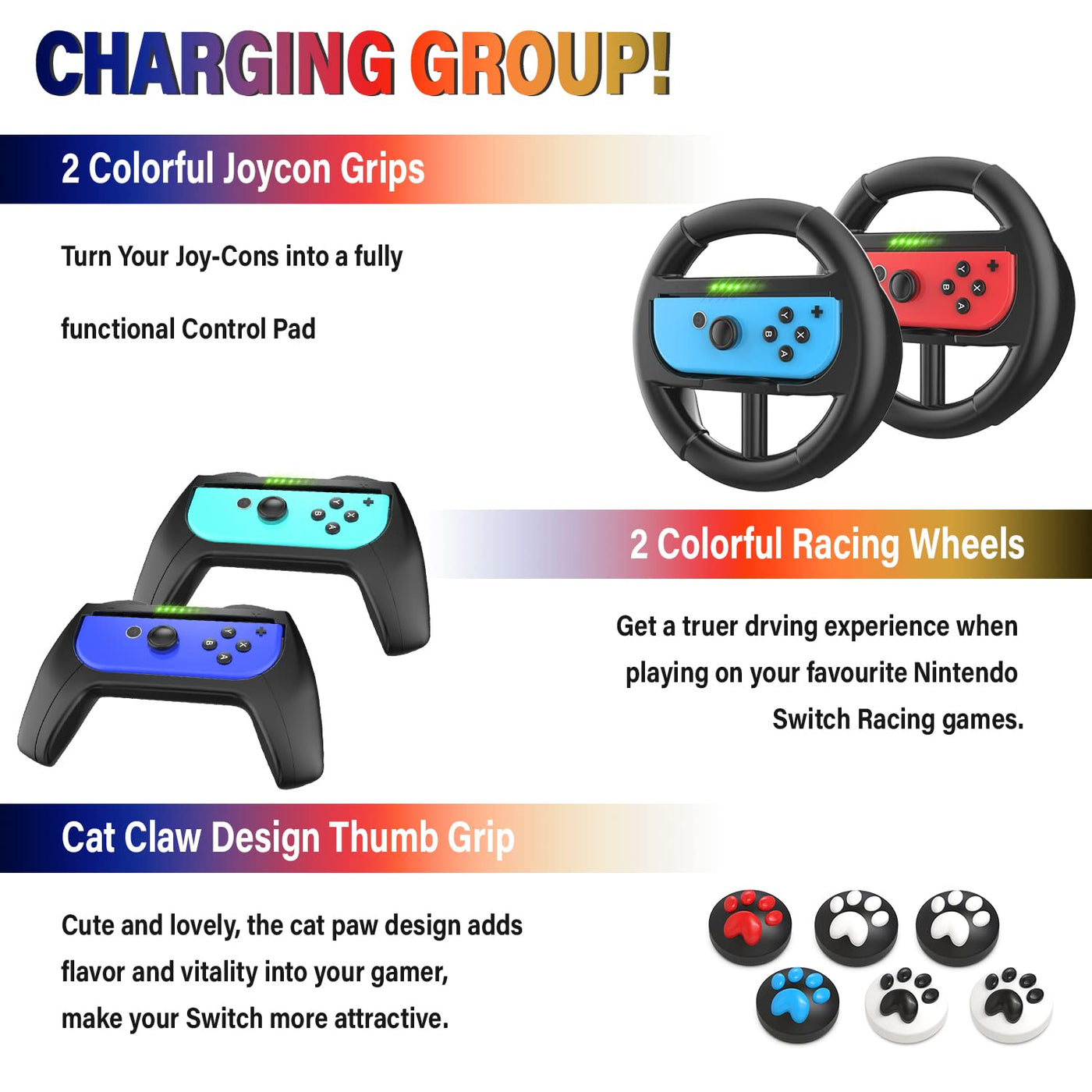 - Switch Bundle Kit CONTAINS: 1x Carrying Case (Fit Nintendo switch Charger), 1x Compact Game Cartridge Case (for up to 8 games), 1x Protective Comfort Case, 1x Compact Playstand, 1x Tempered Glass Screen Protector, 4x Joystick Caps, 1x 4 Channel Charging Dock, 2x Switch Joy-Con Wheel, 2x Switch Joy-Con Grip, 4x Joy-Con Sillicone case