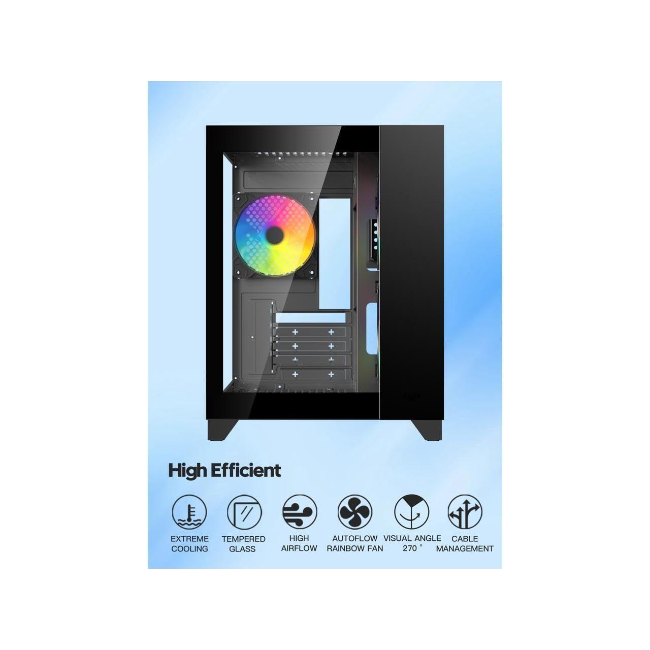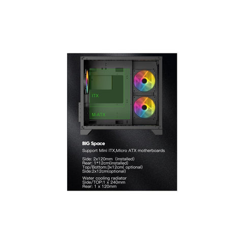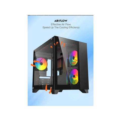 - 9 Fans Capability (2 x 120mm ARGB Reverse Blade Fan x Side, 1 x 120mm ARGB Fan x Rear pre-installed) Provide Great Cooling and Gaming Performance