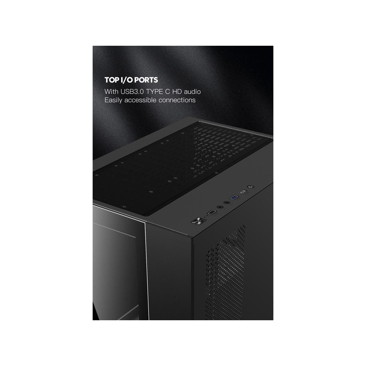 - Panoramic Micro-ATX case with a 270° full view of your masterpiece for building high-performance system. It has 1 x USB 2.0 / 1 x USB 3.0 / 1 x Type C