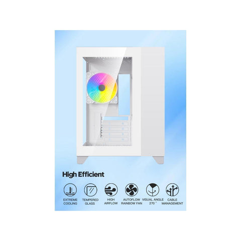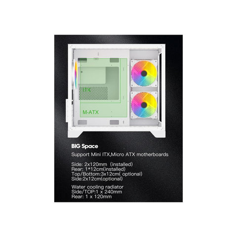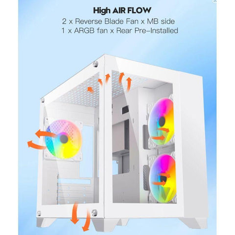 - 9 Fans Capability (2 x 120mm ARGB Reverse Blade Fan x Side, 1 x 120mm ARGB Fan x Rear pre-installed) Provide Great Cooling and Gaming Performance