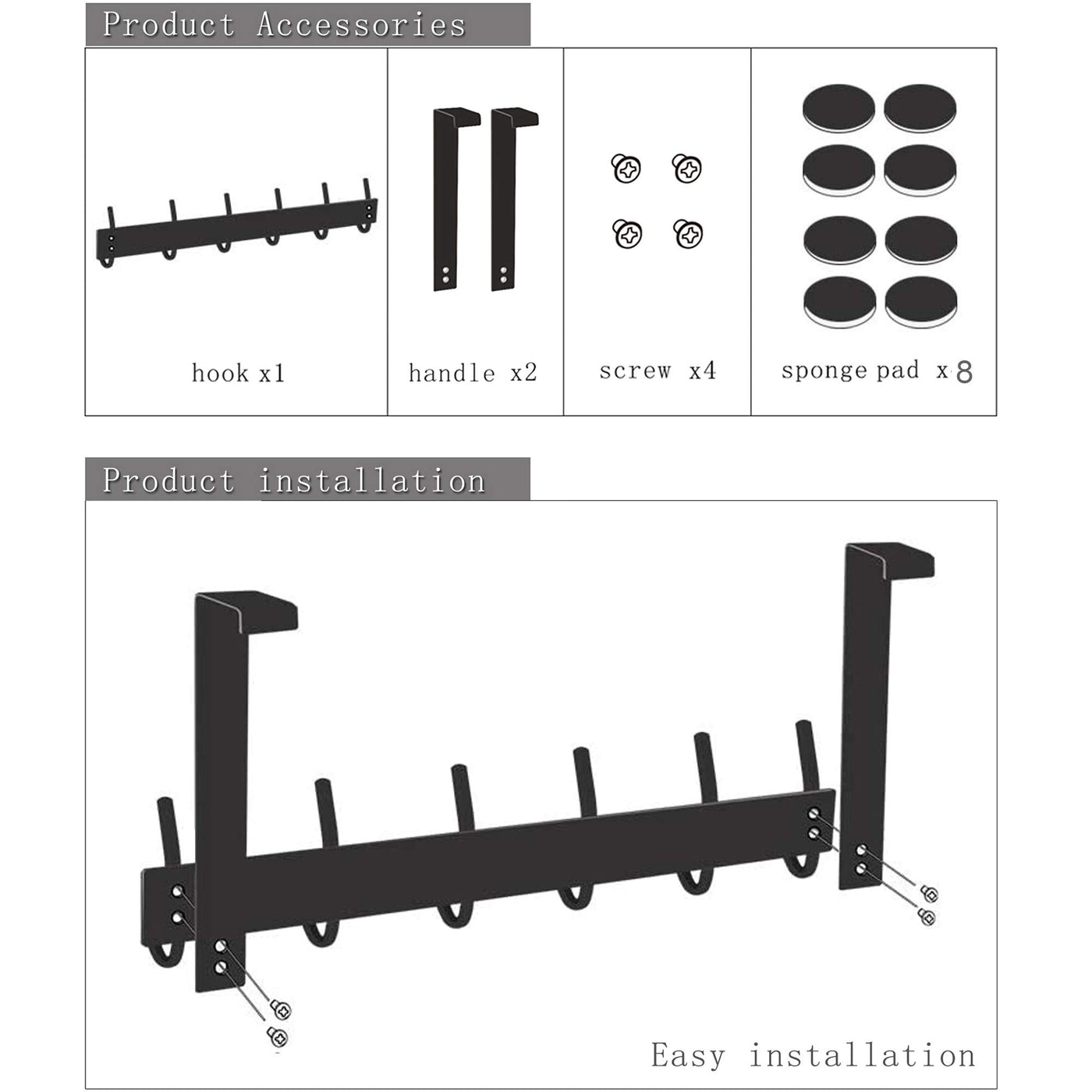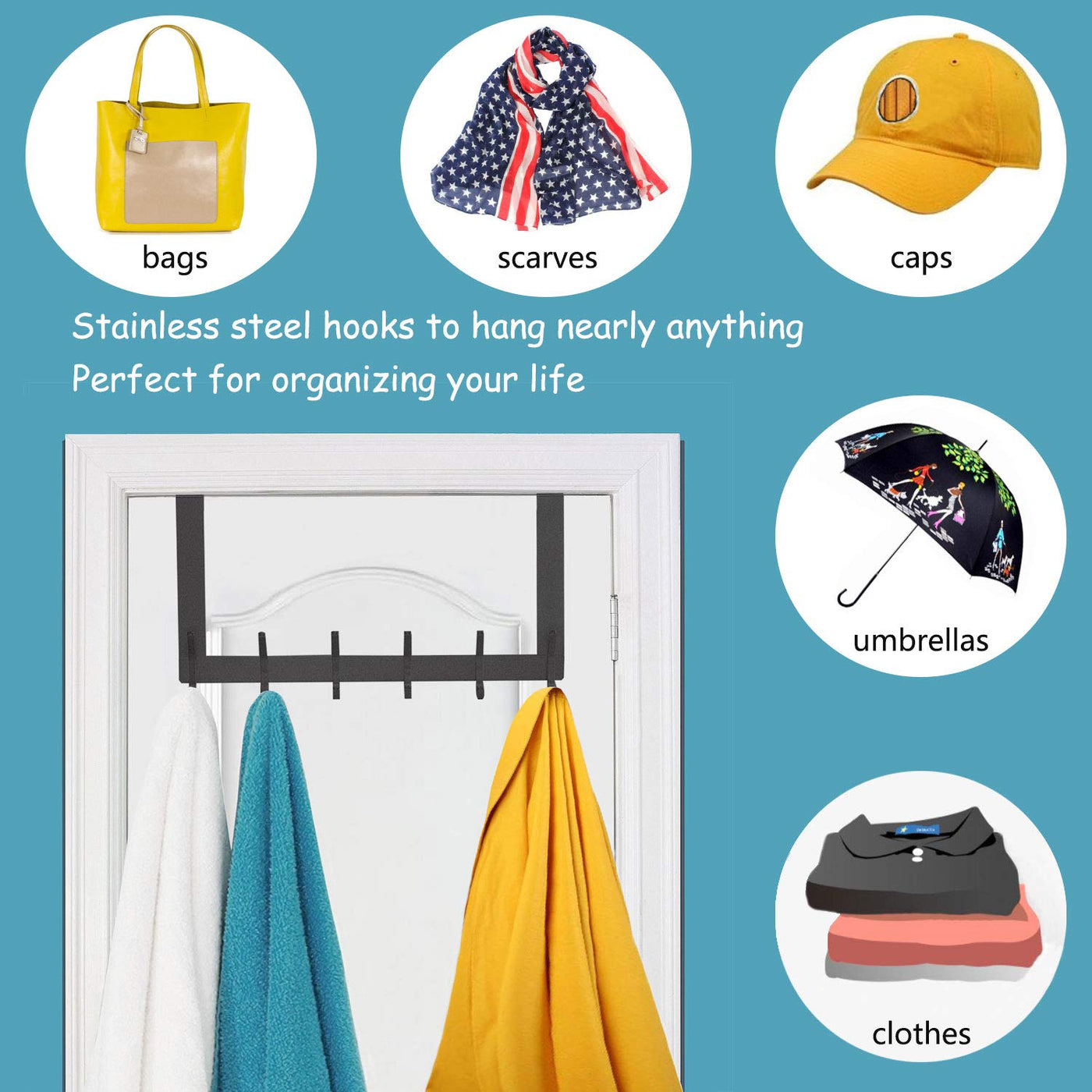 - ✔EASY INSTALLATION & USE - No drilling needed. just insert two hanging brackets into this door hanger hook and hang it over your door. 6 large hooks organize scarves, belts, ties, shirts, jackets, robes, towels, handbags, jewelry, caps, hats, keys, umbrellas, and other accessories.Great for bathroom, bedroom, kitchen and office etc.