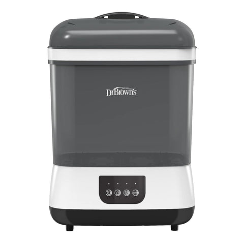 Details: Steam sterilize and dry up to six baby bottles at once, plus bottle parts, breast pump parts, pacifiers, teethers, and more with Dr. Brown's Bottle Sterilizer and Dryer. Steam heat sterilizes to eliminate 99.9% of bacteria, mold, and the yeast that causes thrush. Contents can stay sterilized for 24 hours after the cycle has ended if the lid is unopened – meaning you can keep your bottles and parts stored inside with no contamination. The two included HEPA filters capture up to 95% of airborne particles, ensuring purified air for bottle drying. Each filter lasts up to 6 months for a full year of filtration. Easy-use operation lets you sterilize only, dry only, or combo sterilize and dry. Comes with a removable accessory tray that fits on top of the bottle basket to sterilize bottle parts and accessories. The removable basket is designed to fit all Dr. Brown's bottles and most other bottle brands. Measuring cup included. Warranty valid in the US and Canada only.
