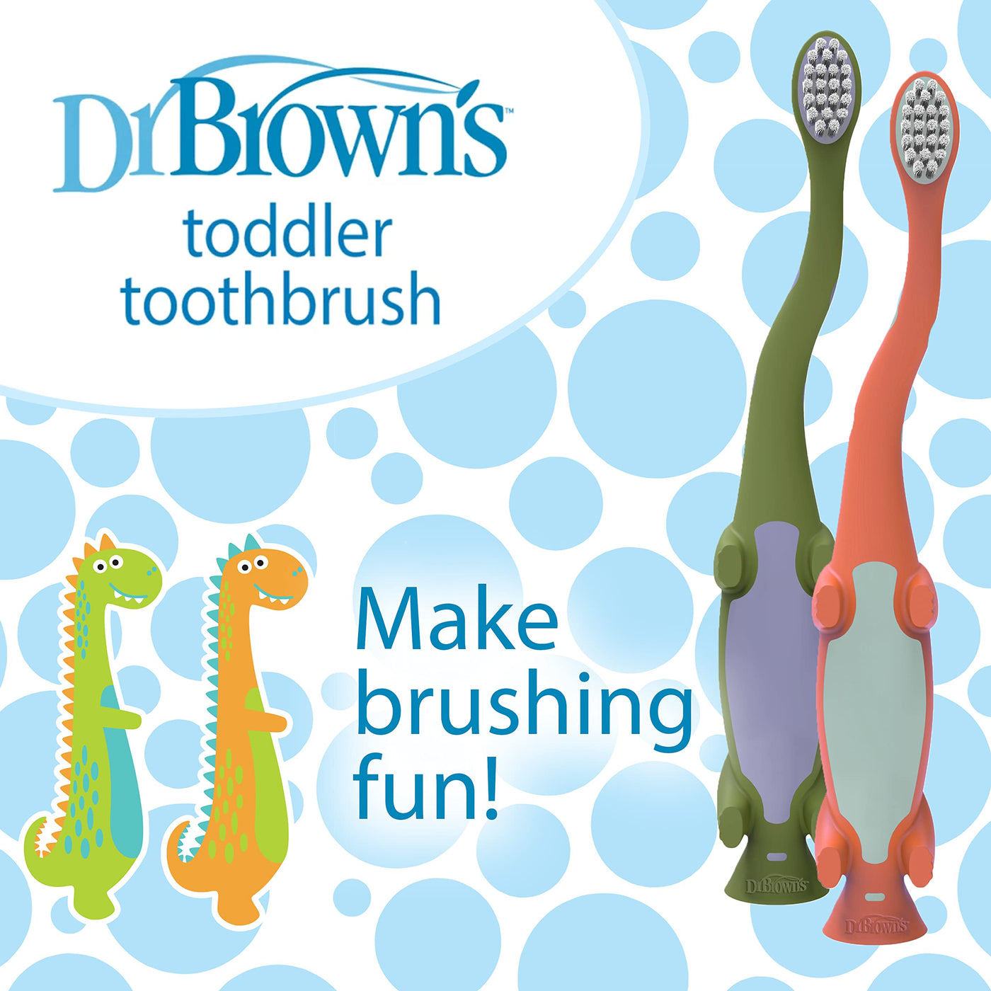 Dr. Brown's Toddler Toothbrush, Dinosaur, Green and Orange, 2-Pack
