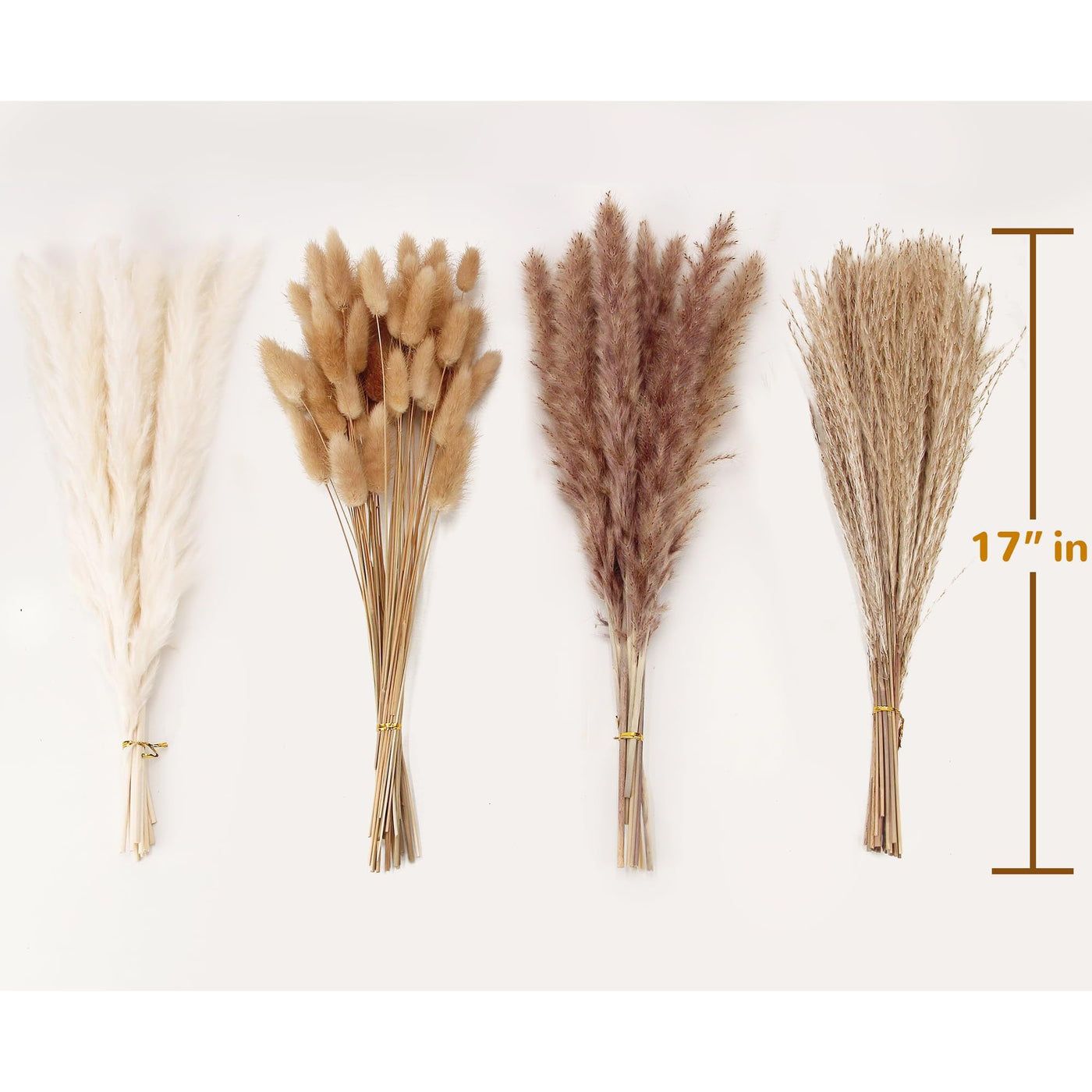 - MORE THAN ONE KIND OF POMPOUS GRASS BOUQUET: carefully selected natural dried pampas grass decor, try to avoid deformation and breakage of dried pampas grass, 100 pieces of pampass grass contain 50 small pampas grass, 20 reed grass, 15 white pompas, 15 brown pompass grass branches(pampas grass vase not included) fill your vase, you can match it with different dried pompas floral bouquets according to your preference