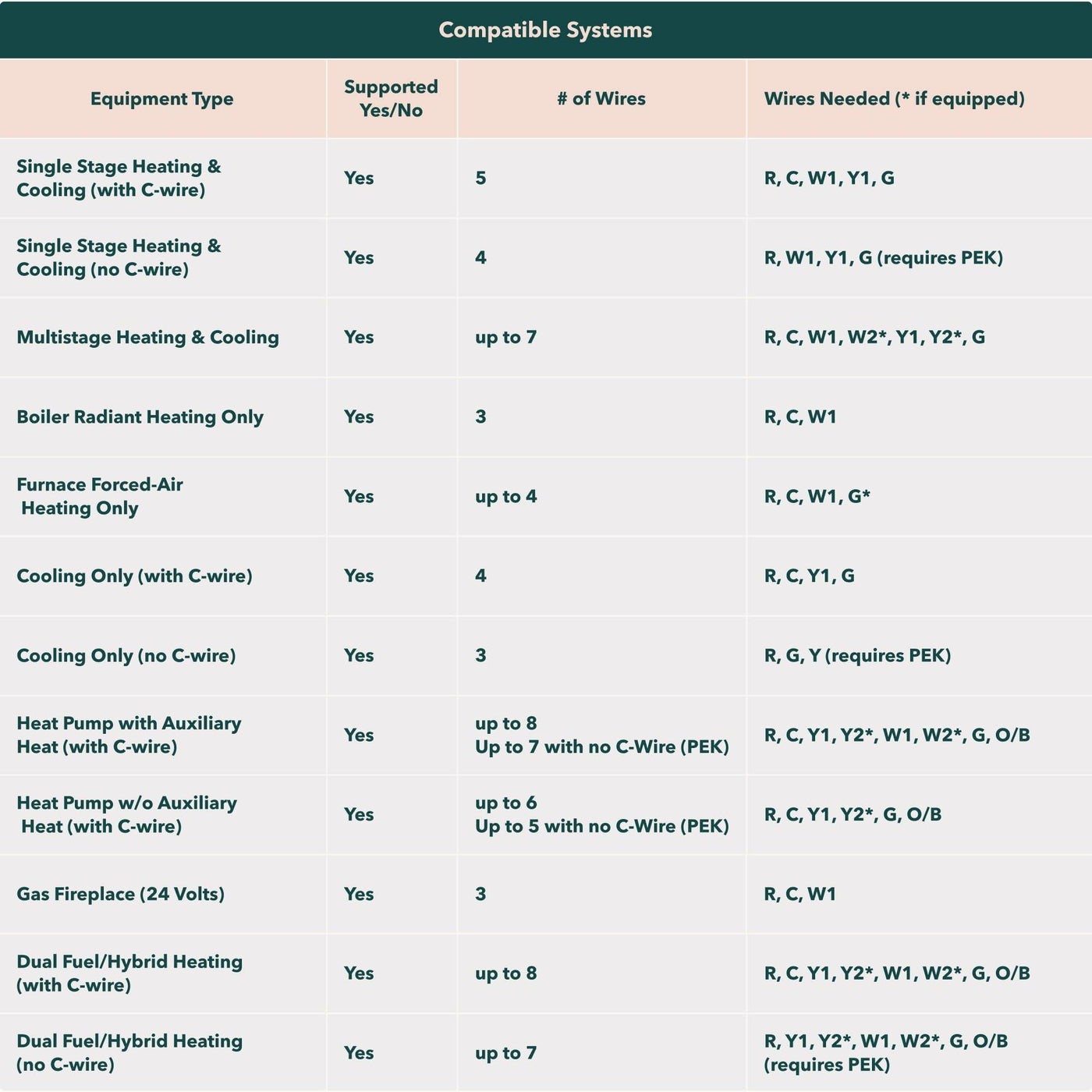 - Works with most 24 VAC HVAC equipment: Gas, oil, electric, dual fuel, forced air Conventional (2H/2C) Heat Pump (3H/2C), & Boilers. Includes Power Extender Kit for homes without a C or Common Wire, to ensure an easy installation