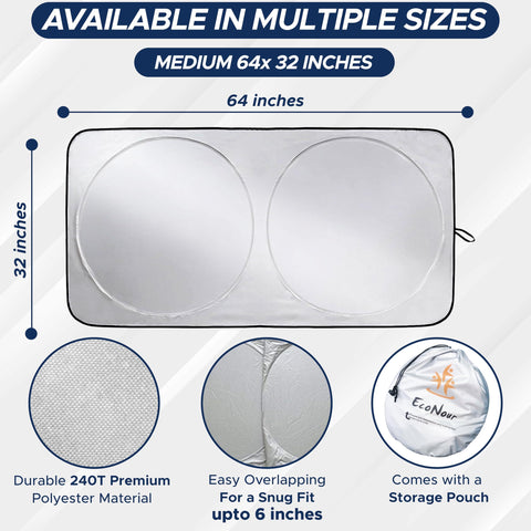 EcoNour Patented Design Car Windshield Sun Shade | Blocks 99% Heat & Keeps Interior Cool | Fits Cars, SUVs, Trucks | Automotive Sun Screen, Visor & Car Accessories for Summer | Medium (64x32 Inches)