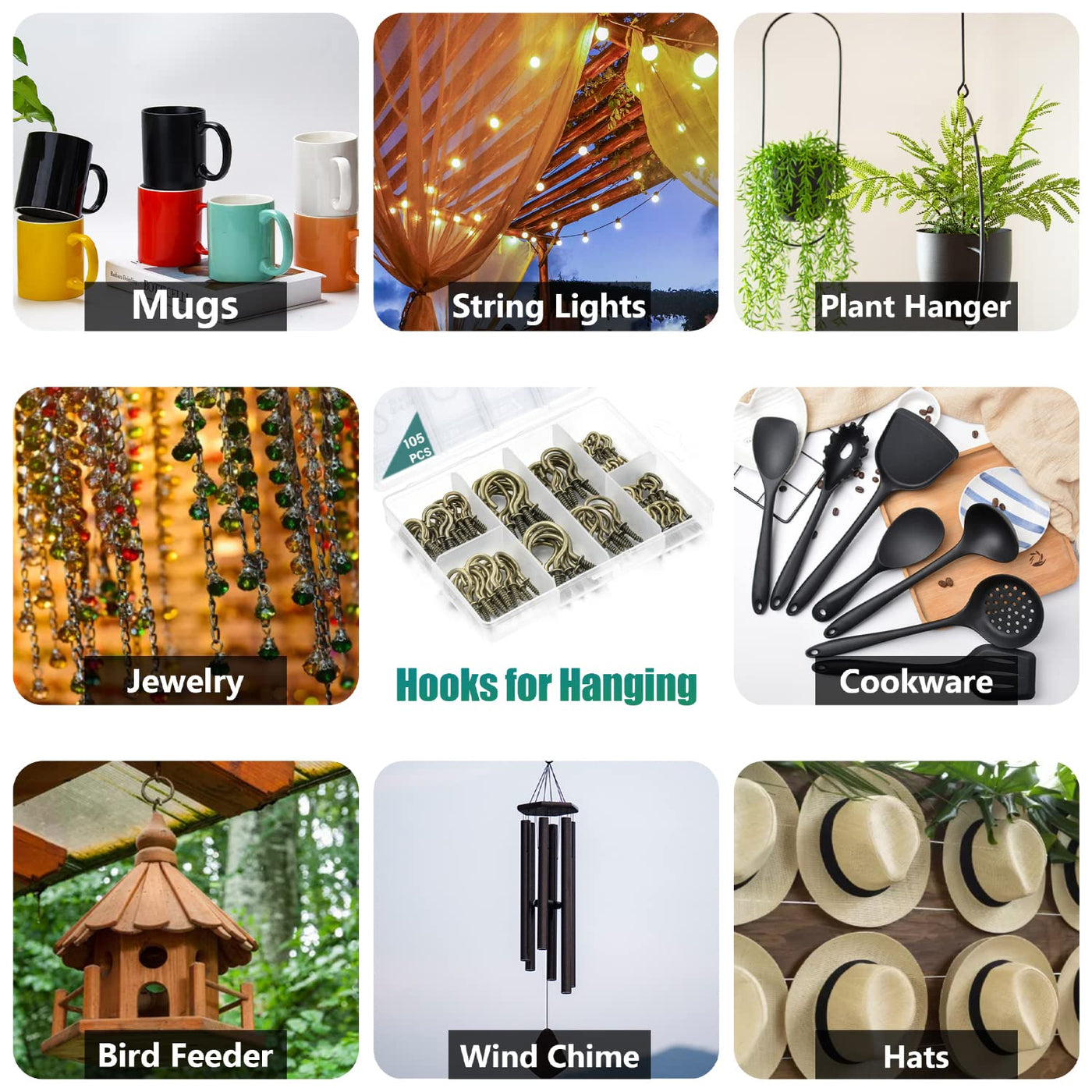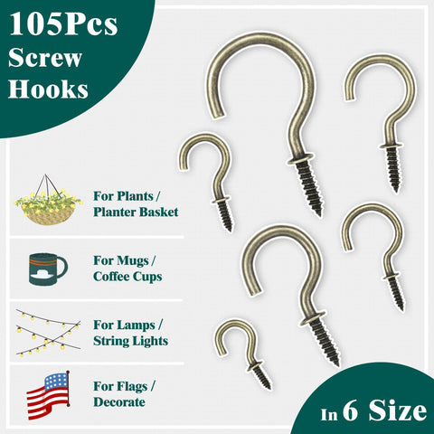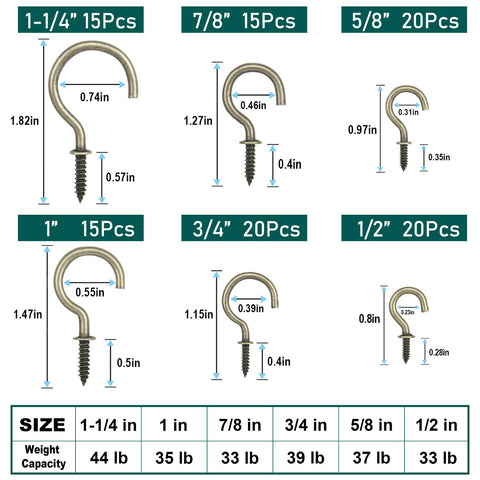 - 【Various Sizes】Small to large size screw hooks to meet your needs: 1-1/4 inch(15pcs), 1 inch(15pcs), 7/8 inch(15pcs), 3/4 inch(20pcs), 5/8 inch(20pcs), 1/2 inch(20pcs), 105pcs in total