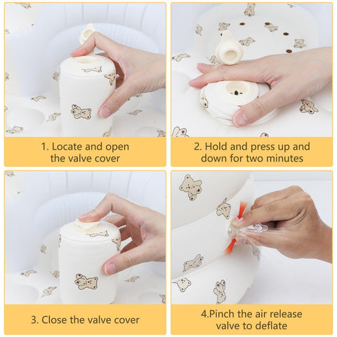 - Easy to Use: Inflatable baby feeding chair can be easily inflated within 3 minutes by pressing the built in air pump up and down. Due to the leak-proof design, it is necessary to pinch the air valve when deflated. After deflates, folds and stores compactly, making it a great companion for travel, camping or outing