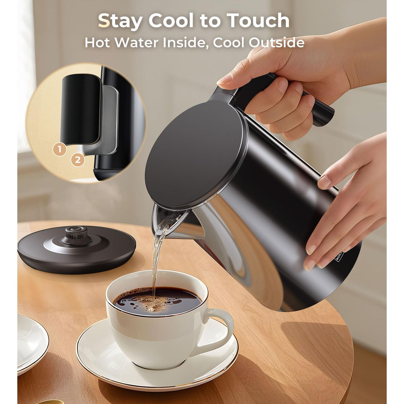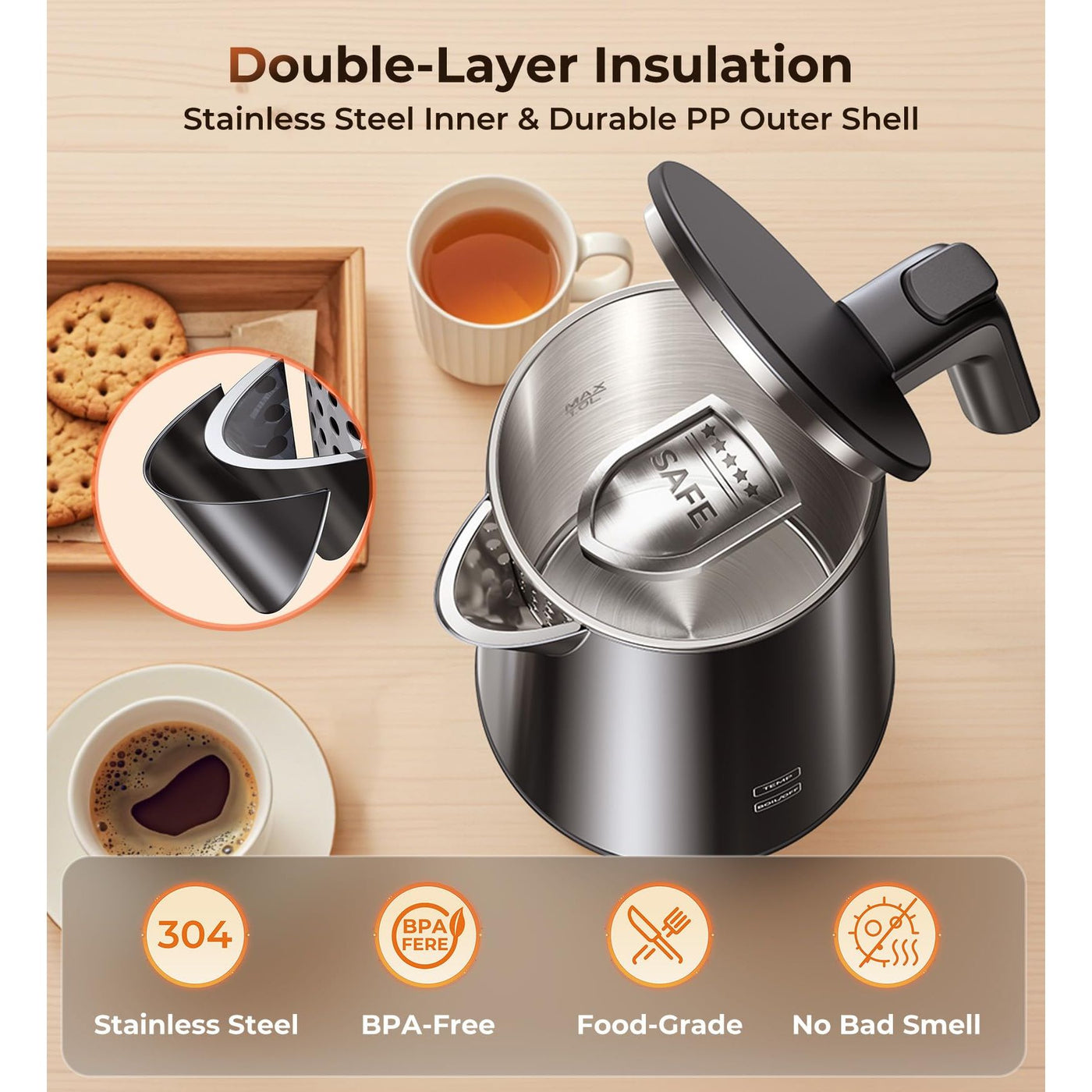 - 【Durable Stainless Steel Construction】Built with food-grade stainless steel and a sleek, heat-resistant PP exterior, this electric kettle combines style and safety. The cool-touch handle and surface ensure comfortable handling, even during extended use