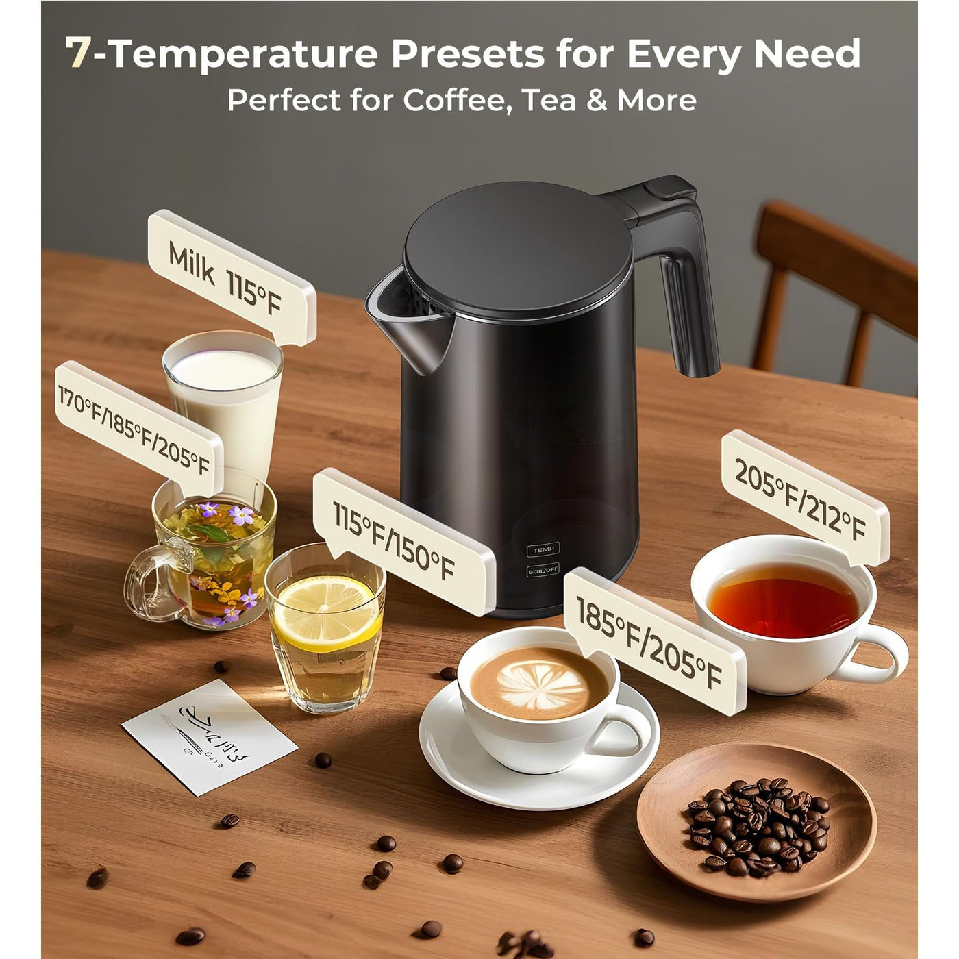 - 【Versatile Electric Kettle with Precision Control】 This electric tea kettle features 7 temperature settings(115°F-212°F), ensuring perfect brewing for green tea, coffee, or oatmeal. The rapid-boil technology heats water faster than standard kettles, while the auto-shutoff function enhances safety during use