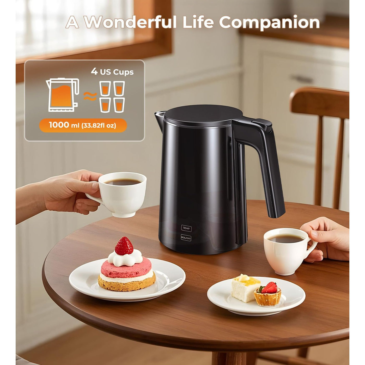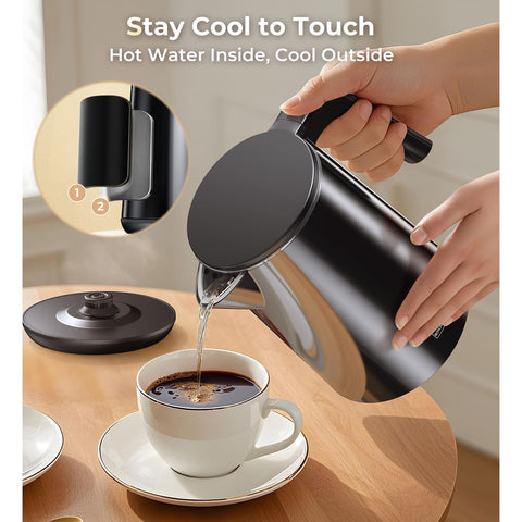 - 【Stay Warm, Stay Safe】This electric tea kettle’s 4-hour keep-warm function means your water stays ready for refills or second cups. The stainless steel interior ensures durability, while the PP outer layer and cool-touch surface prevent burns, making this tea kettle safe to use