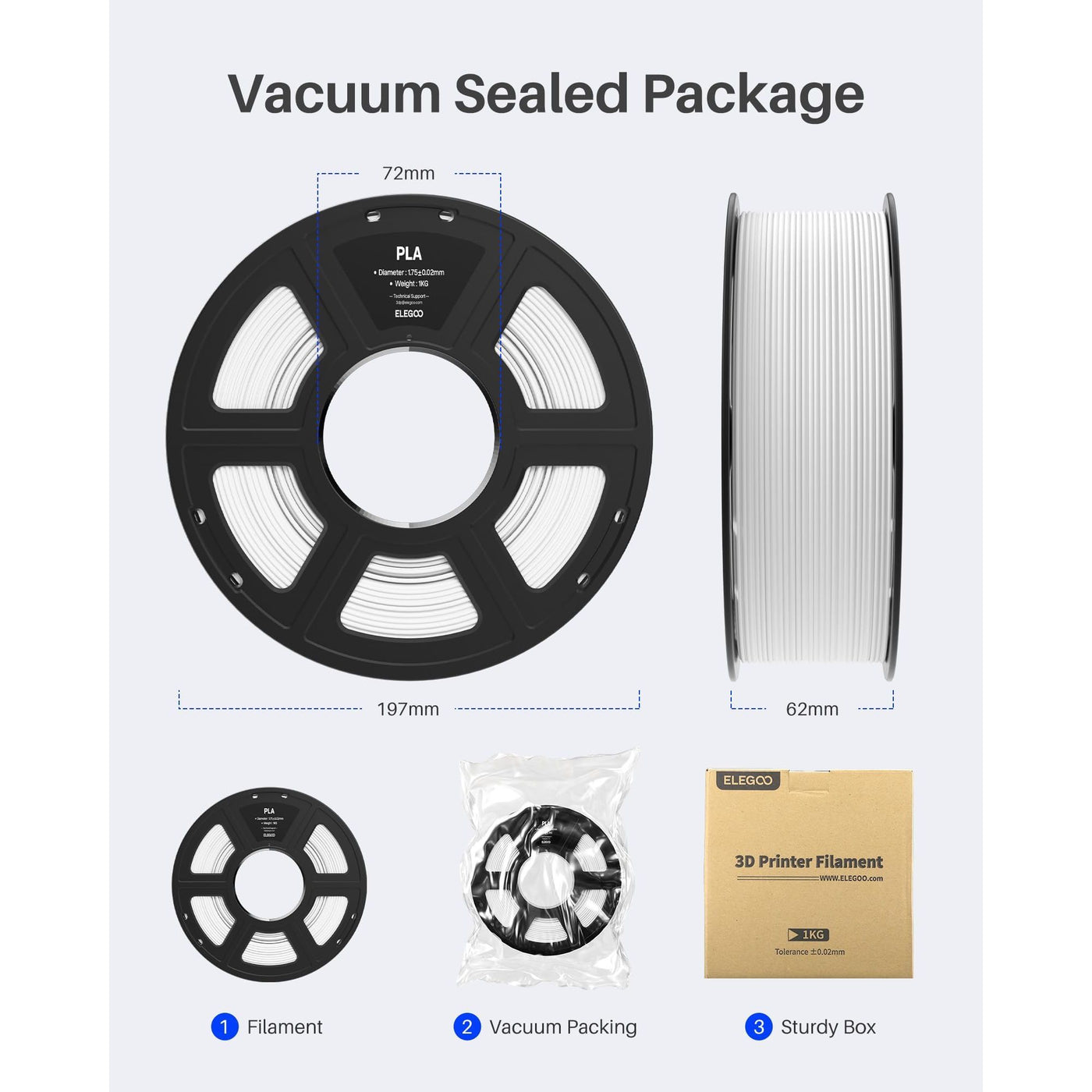 - NO CLOGGING & NO BUBBLE: ELEGOO PLA Filament is complete dried before packaging and vacuum sealed well to protect the filament from moisture, no clogging and bubbling problems