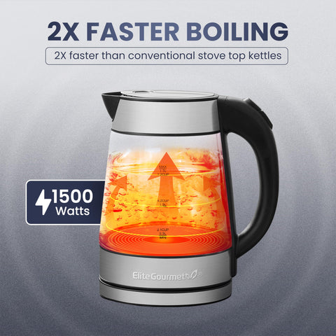 Details: The Elite Gourmet Cordless Electric Glass Kettle is the perfect blend of elegance and functionality. Not only is this kettle a beautiful addition to any kitchen countertop, but it also boils water efficiently, saving time and energy over the use of conventional stovetop kettles.