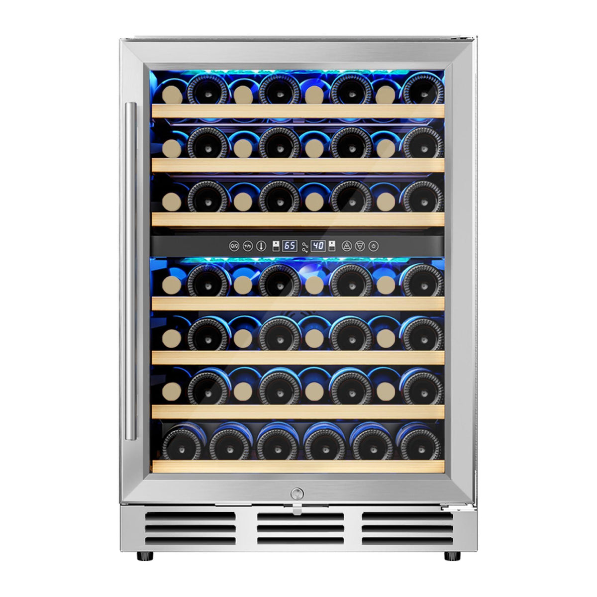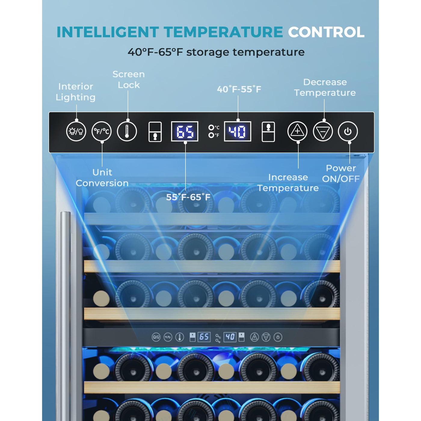 - 【Dual-zone Temperature Adjustment】The dual zone wine fridge features an intelligent temperature control system with an upper zone temperature range of 40˚F-55˚F, and a lower zone with a constant temperature of 55˚F-65˚F. This wine cooler has a temperature memory function that restores the set temperature after a power failure. It allows you to enjoy the best taste at all times!