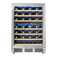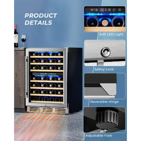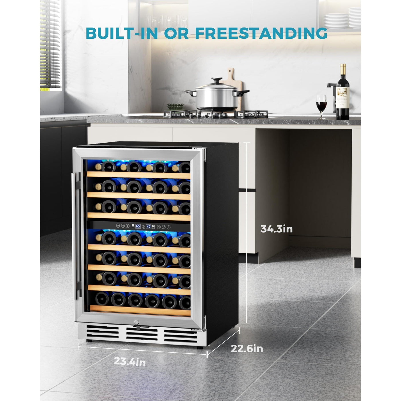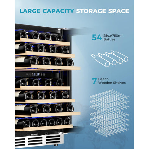 - 【Large storage space】This wine fridge under counter has a spacious storage space that can easily hold up to 54 bottles of wine with 7 adjustable wood shelves. Each shelf of the mini fridge is not only load-bearing, but can also be adjusted in height to meet your diverse wine storage needs. It takes 23.4''W x 22.6''D x 34.3''H of your space.