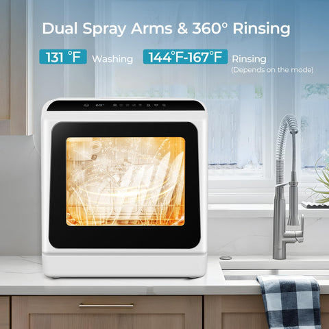 ๐๐ฆ๐ข๐ฅ๐ฒ ๐๐๐ฆ๐๐๐ซ๐ฌ: The Euhomy compact dishwasher boasts 6 programs for your family: Normal, Quick, ECO, Baby Care/Heavy Duty, and Fruit, Dry. The Quick offers a 29 minutes fast wash. While the Baby Care/ Strong mode of our mini dishwasher operates at a scorching 167ยฐF, ensuring baby products and greasy dishes are thoroughly rinsed. The Also, our small dishwasher's dual spray arm system delivers 360ยฐ profound cleaning, ensuring accessories can be thoroughly washed even pet bowls, collars, leashes, and more. You can experience customized cleaning with this versatile dish washer easily