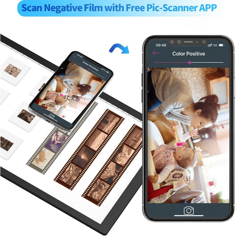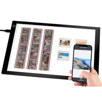 - 【Ultra-Thin and Large】The light panel is incredibly thin, measuring only 0.2 inches. The viewing area is slightly larger than A4 size, allowing you to scan multiple negatives, photos and slides simultaneously on your phone. Slide & Negative Scanners