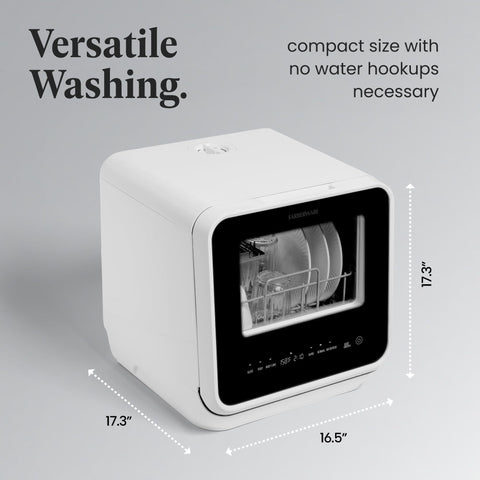 Details: The Farberware Portable Countertop Dishwasher works for small kitchens, apartments, RVs, and even on camping trips. With its 5-liter built-in water tank, you no longer need to worry about hooking up to a water source. Fill the tank, plug it in, and let the powerful 5-program system take care of the rest. Our portable dishwasher is not just limited to cleaning dishes. It also features a baby care function, ensuring your baby bottles are steam-cleaned and sterilized to perfection. The glass and fruit wash programs are designed to give your glassware a sparkling clean finish and gently wash your fruits and vegetables. The Farberware Portable Countertop Dishwasher can make an excellent addition to your home or on-the-go lifestyle, making dirty dishes a thing of the past.