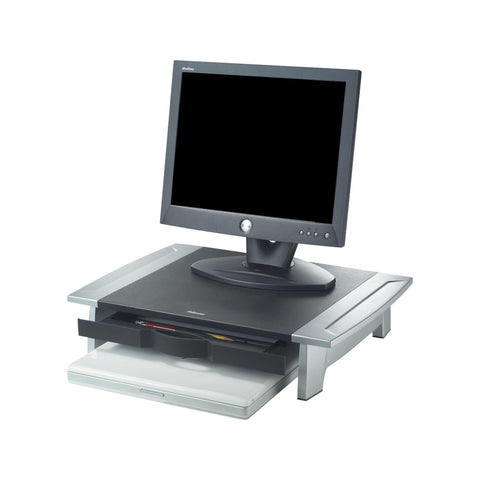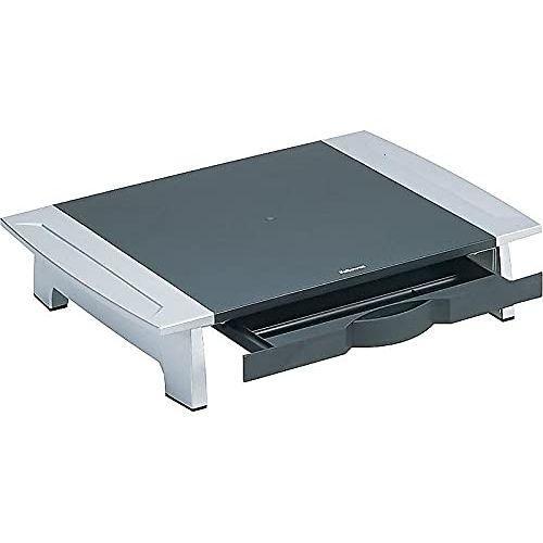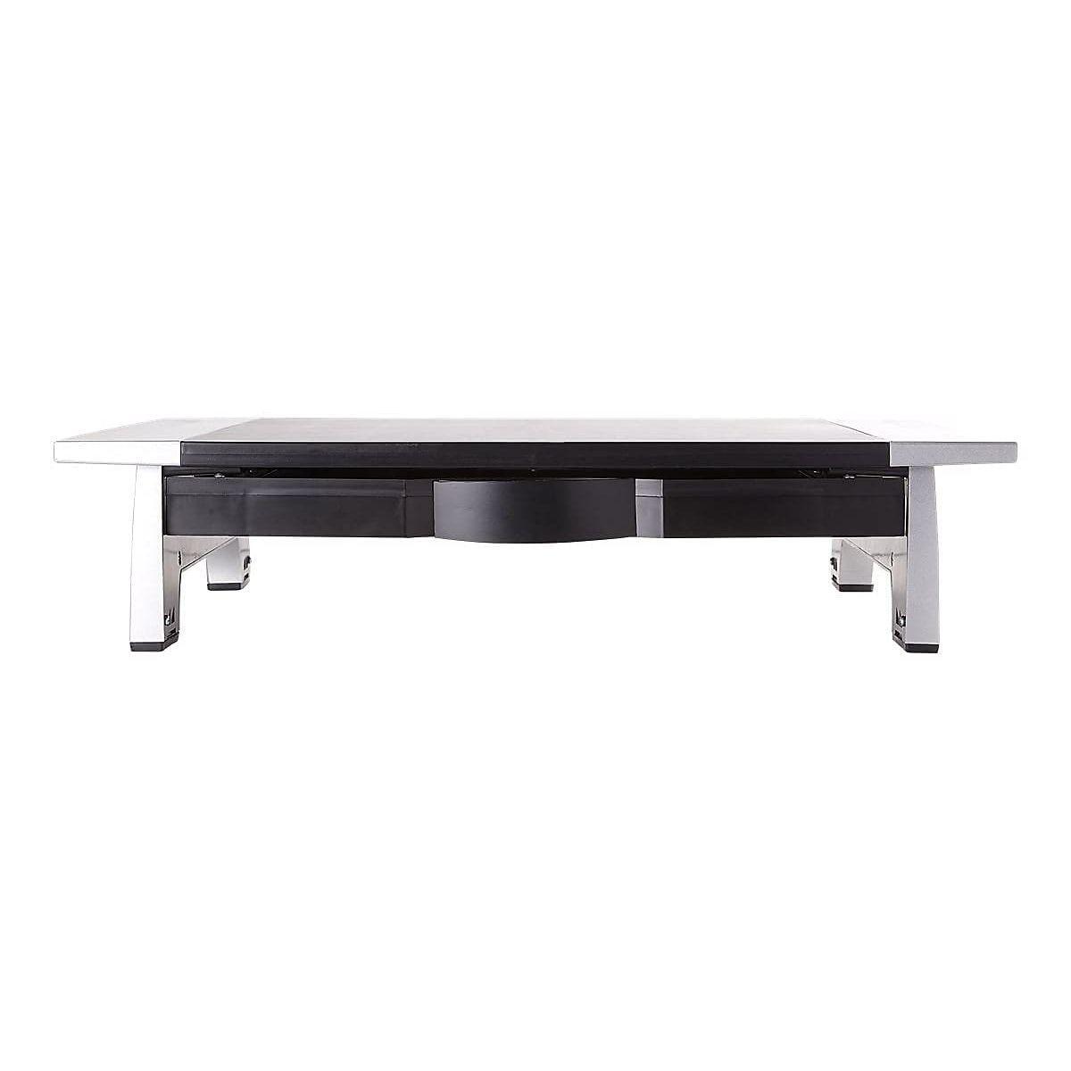 Details: Monitor Riser, HPS, Black/Silver, Weight Capacity 80 lb, Width 19 7/8 in, Height 4 in, Depth 14 in, Includes Accessory Tray