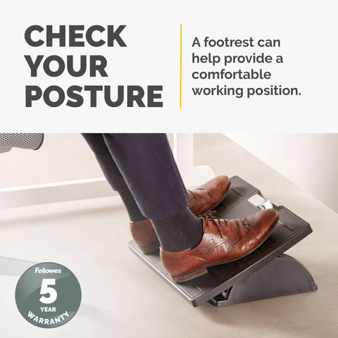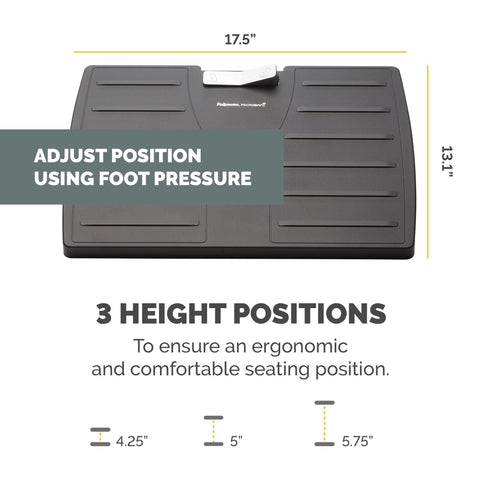 The Office Suites Adjustable Footrest comes with Microban antimicrobial protection to keep product cleaner. Adjustable footrest tilts 30 degrees forward or back. Locks in place or tilts freely for improved circulation. Height adjusts to 4 1/8", 4 7/8" or 5 5/8".