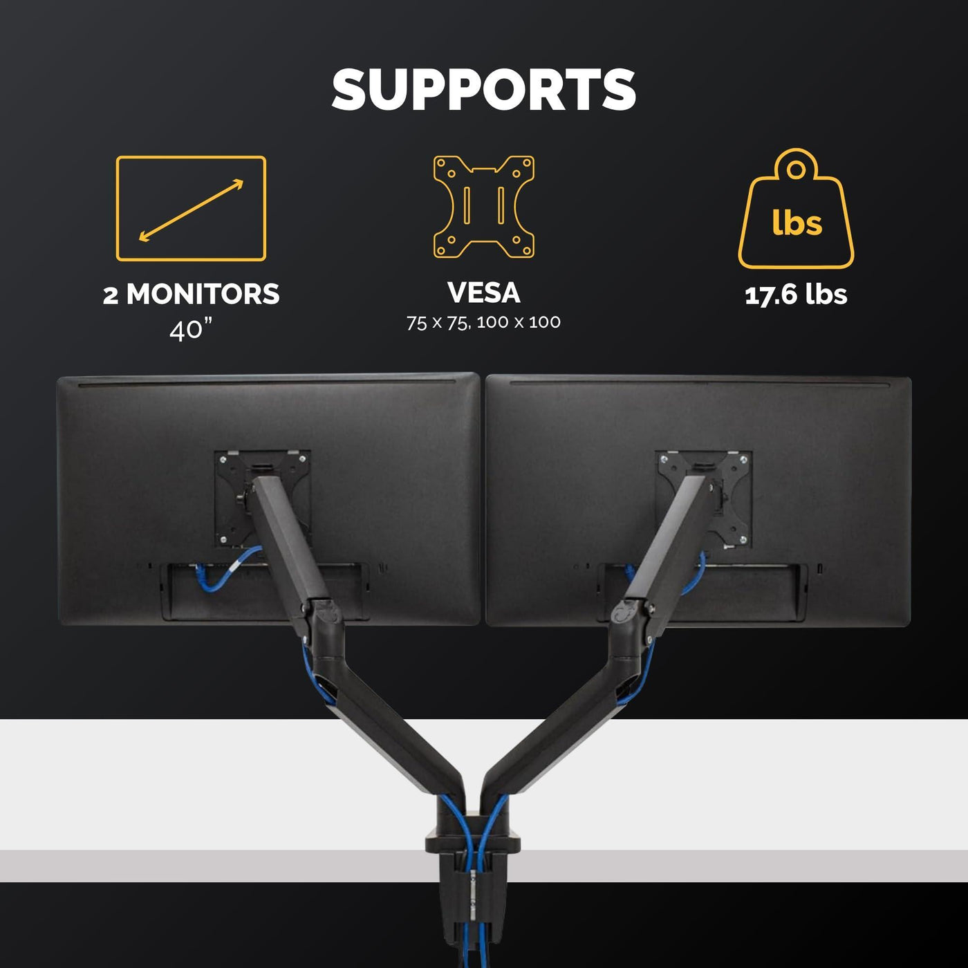 - SUPPORTS: Dual monitors up to 40" and 17.6 lbs each, perfect for home, office, or gaming setups