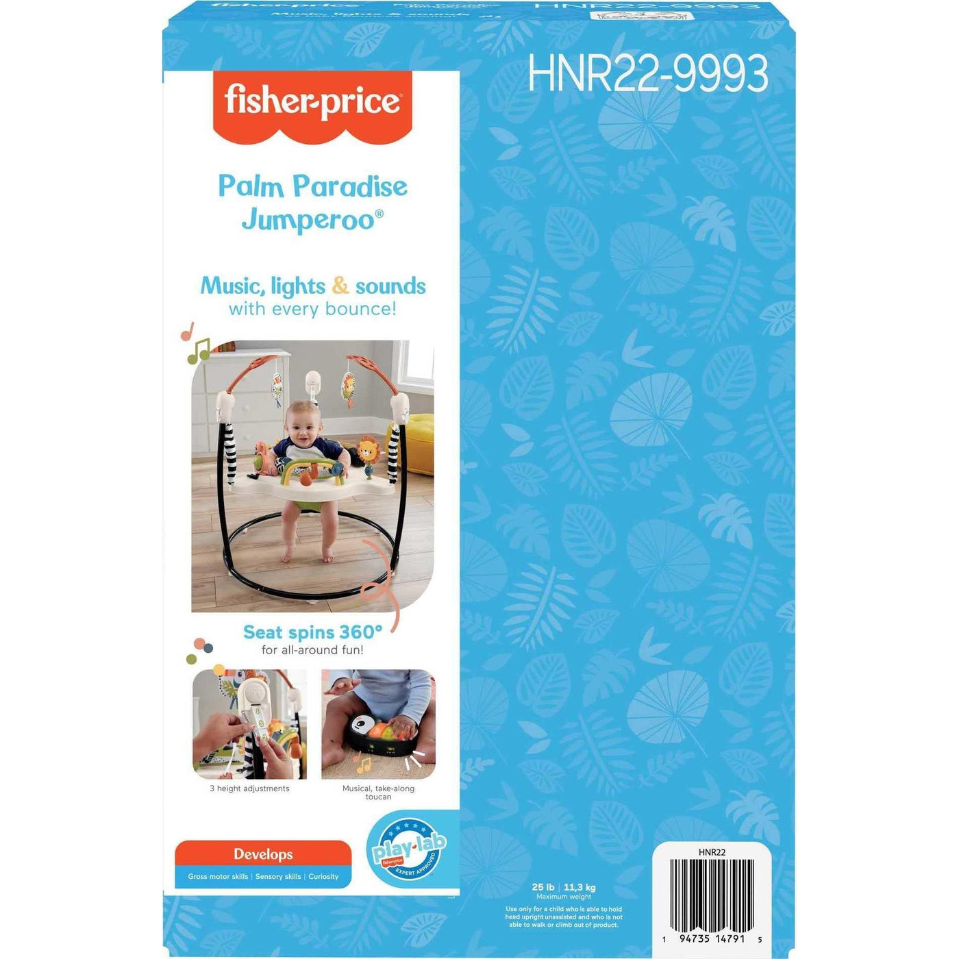 Details: The Fisher-Price Palm Paradise Jumperoo activity center gets your baby bouncing into a stimulating sensory paradise! Every jump activates fun lights, music and sounds that encourage your little one to keep moving and strengthen gross motor skills. The freestanding jumper has a spinning seat and a variety of hands-on activities all around for your baby to explore, plus three height adjustments to grow along with your baby. Max. weight 25 lb/ 11,3 kg. Use only for a child who is able to hold head upright unassisted and who is not able to walk or climb out of product.