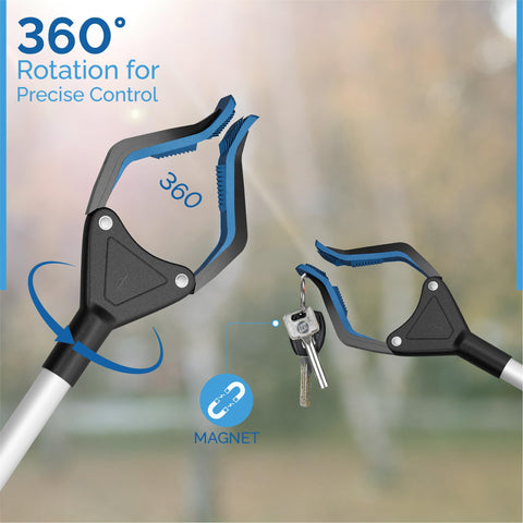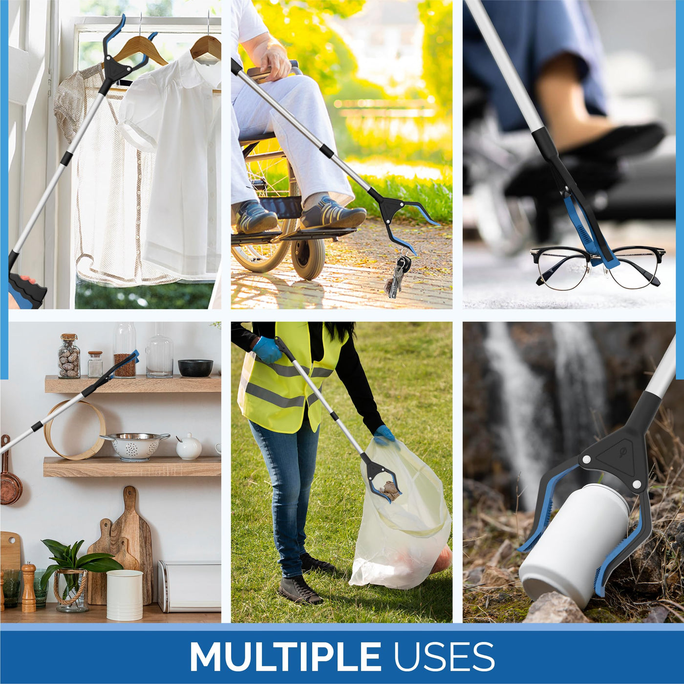 Details: Professional Grabber Reacher Tool - Extended Reach Pick-Up Device The Grabber Reacher Tool is an essential mobility aid and household utility device designed to extend your natural reach by 26-31 inches. This lightweight aluminum pickup stick features ergonomic gripping mechanisms and precision jaw control for, effortless object retrieval without bending, stretching, or climbing. Alternative Names & Terms: Reacher grabber tool, Pickup stick, Reaching aid device, Grab stick, Reacher stick, Pick-up tool, Grabbing stick, Extended reach tool, Mobility reacher, Assistive reaching device, Long arm grabber, Pickup reacher, Grab and reach tool Key Features: Extended Length: 31-inch reach extension eliminates stretching and bending. Lightweight Construction: Durable aluminum frame weighs only 8 ounces for easy handling Ergonomic Trigger Handle: Comfortable grip design reduces hand fatigue during extended use Precision Jaw Control: Spring-loaded mechanism provides adjustable gripping pressure Rotating Head: 360-degree swivel capability for accessing objects at any angle Rubberized Gripping Surface: Non-slip jaw coating prevents dropped items and protects delicate objects Magnetic Tip: Built-in magnet for picking up small metal objects like screws, nails, and keys Folding Design: Collapsible shaft for compact storage and portability Primary Uses & Applications: Mobility & Accessibility Assistance: Used by seniors to maintain independence and avoid reaching Used by individuals with disabilities including wheelchair users, those with limited mobility, arthritis sufferers, and people with back problems Used during injury recovery when bending or stretching is restricted. Used by people with chronic pain conditions to reduce physical strain