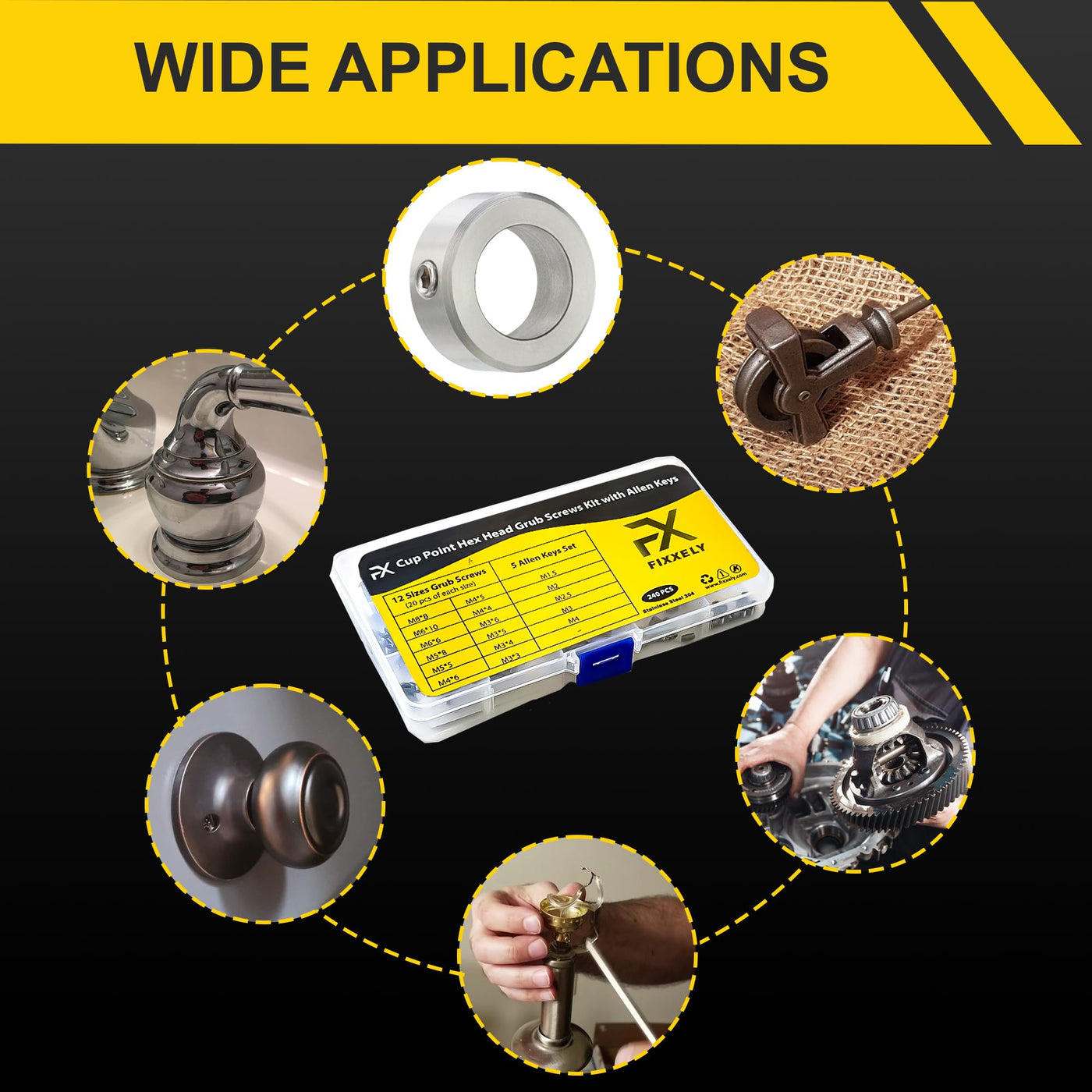 - Package Includes: A total of 240 pieces metric set screw assortment kit with the sizes M3*3, M3*4, M3*5, M3*6, M4*4, M4*5, M4*6, M5*5, M5*8, M6*6, M6*10, M8*8 having 20 pcs each along with 5 Allen Keys of size M1.5, M2, M2.5, M3, M4