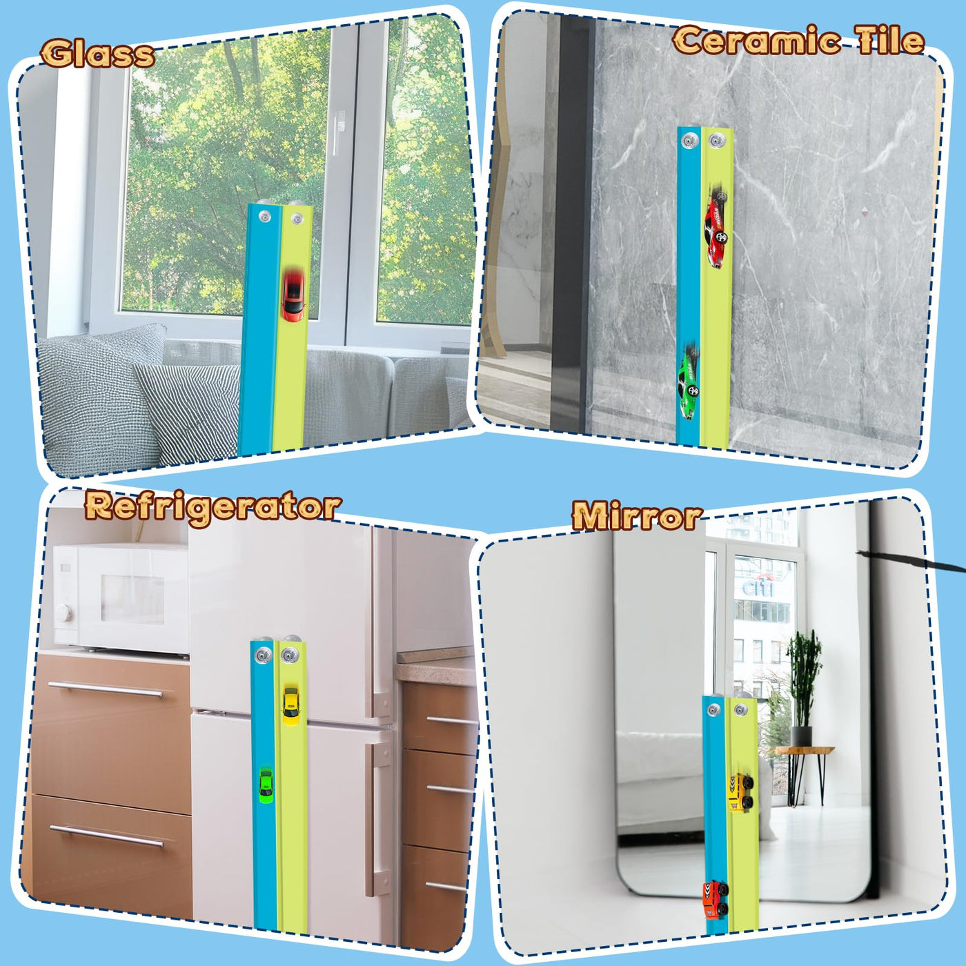 - This magical track is equipped with powerful suction cups and legendary resilience, allowing it to adhere to almost any smooth and flat surface you desire, including windows, tiles, mirrors, and even refrigerators!