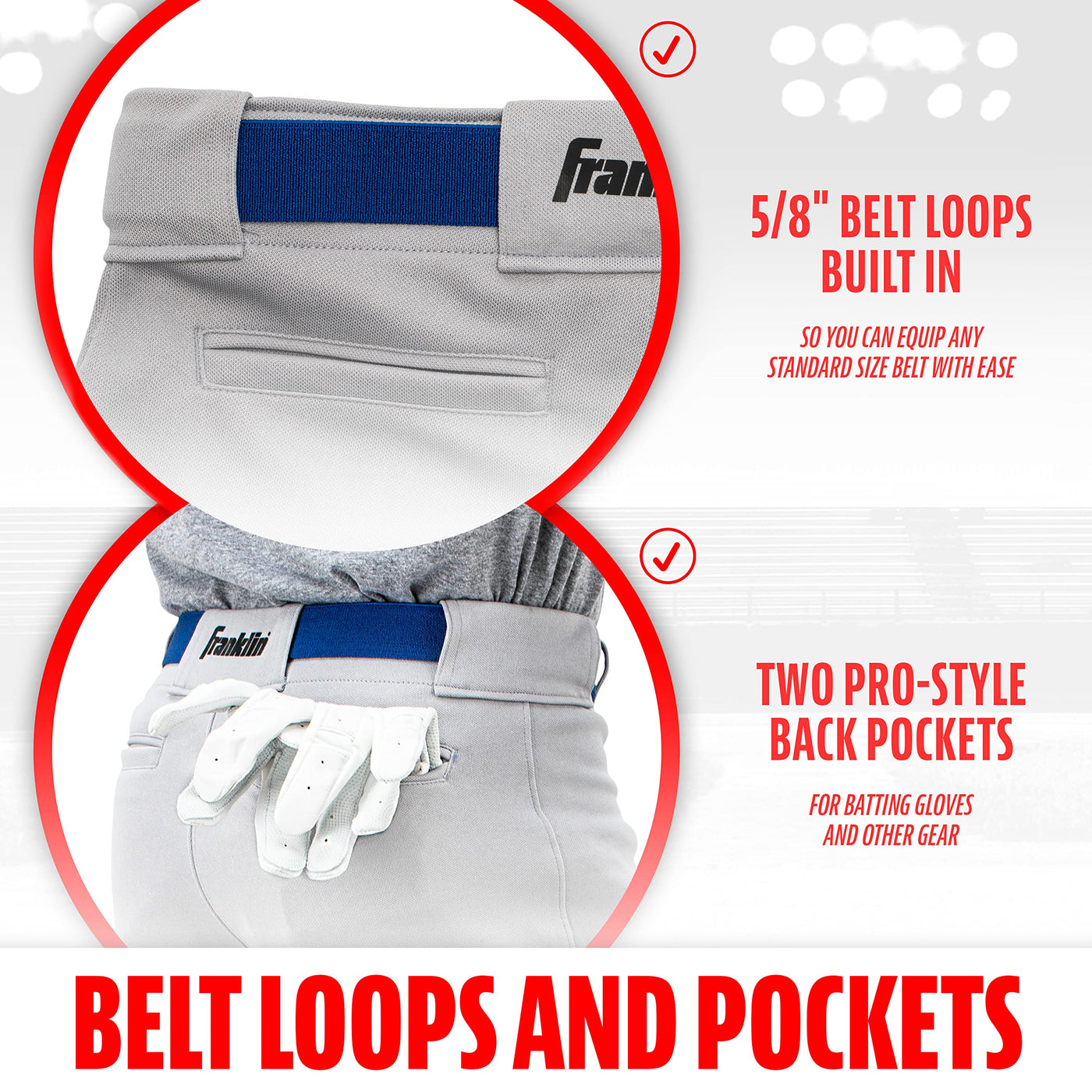 - BELT LOOPS AND POCKETS: These pants come with 5/8" belt loops built in so you can equip any standard size belt with ease and two pro-style back pockets for batting gloves and other gear