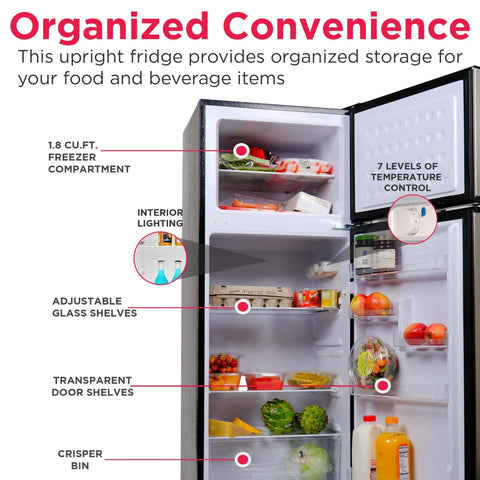 - ORGANIZED CONVENIENCE: Equipped with removable glass shelves, a transparent crisper, and a full-width door bin, this small upright fridge offers organized and convenient storage for all your food and beverage items.