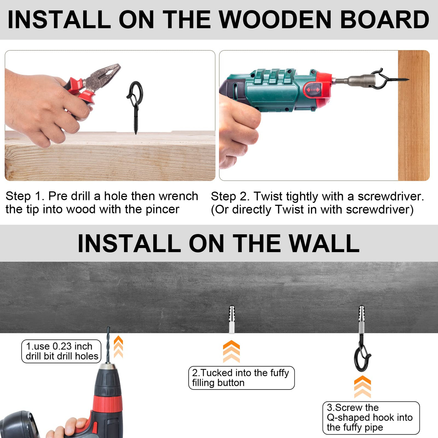 - Easy To Install : Come with plastic tubes, swivel cup hooks for hanging are easy to mounted on all solid surface such as walls, ceiling, wooden beams, tree, fence, eaves etc. You can pre drill a hole then wrench the string light hooks outdoor directly in.