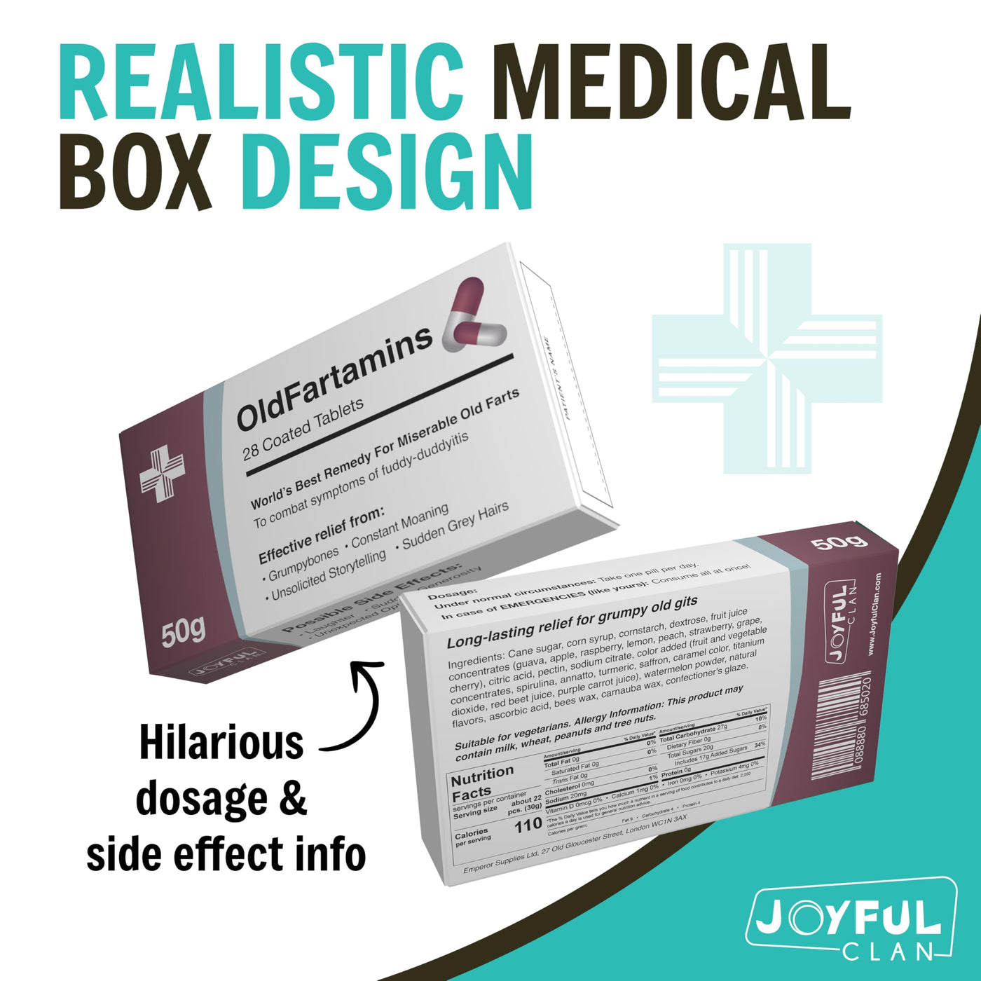 - LAUGH YOUR WAY TO "YOUTH" - embrace the inevitable with OldFartamins, the ultimate gag gift for those celebrating another trip around the sun. Packed with candy in a pretend prescription pill box, this funny gift is guaranteed to bring a smile to even the grumpiest of old farts, proving that age is just a number - and a punchline!